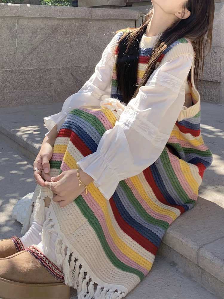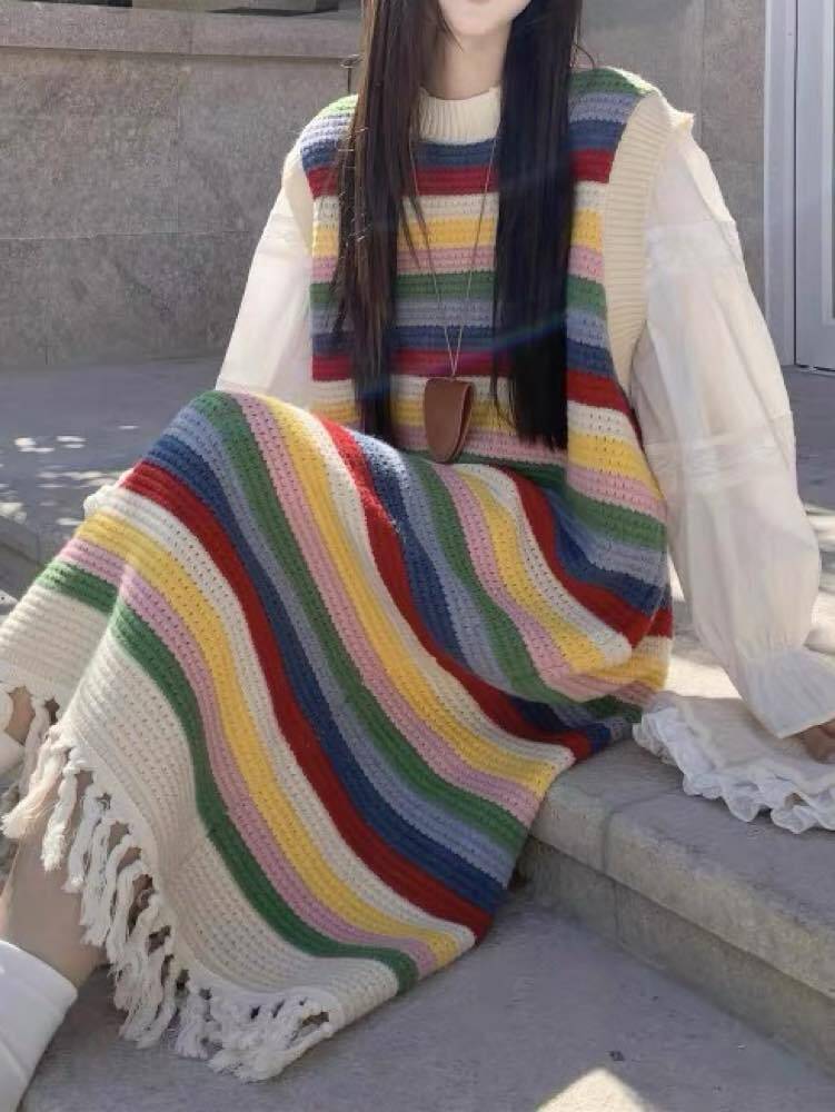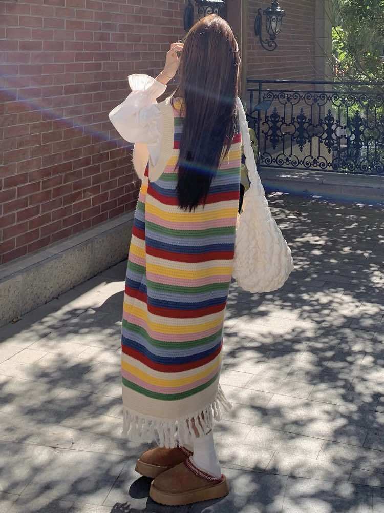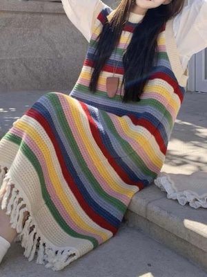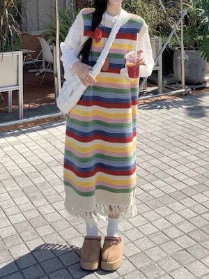 気分高まるカラフルスタイル♪ 裾フリンジニットベストワンピース 大人可愛い お洒落 ニット フリンジ レイヤード カジュアル ボーダー Iライン 体型カバー 大きいサイズ 韓国 CH11520