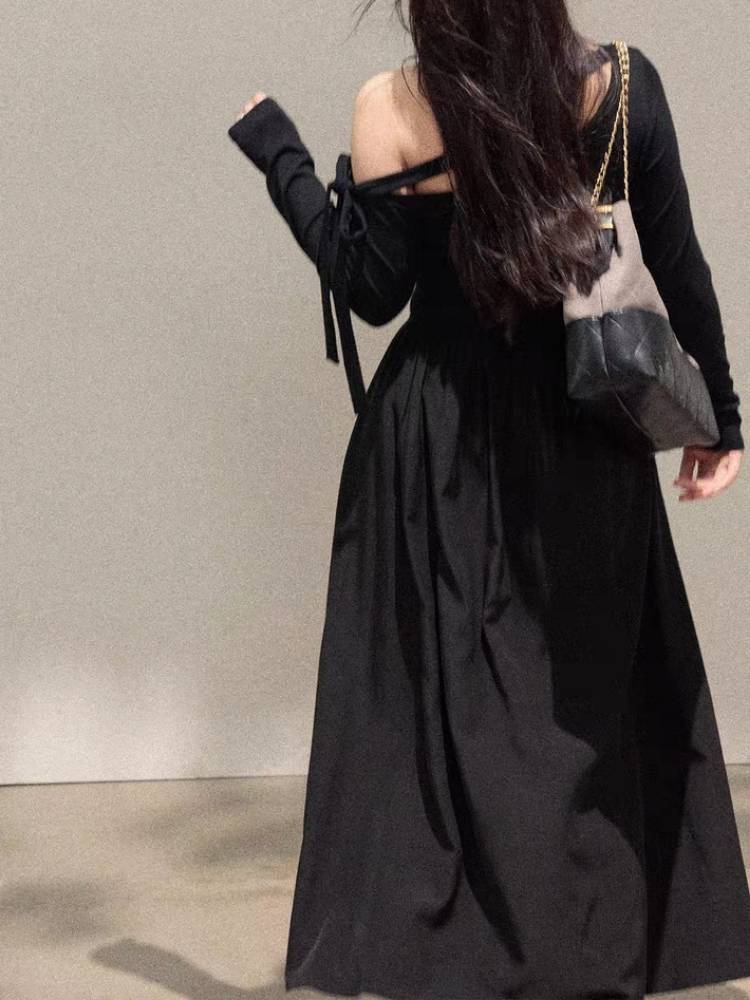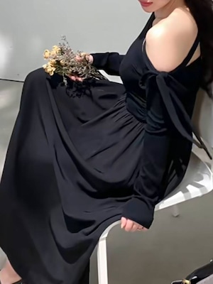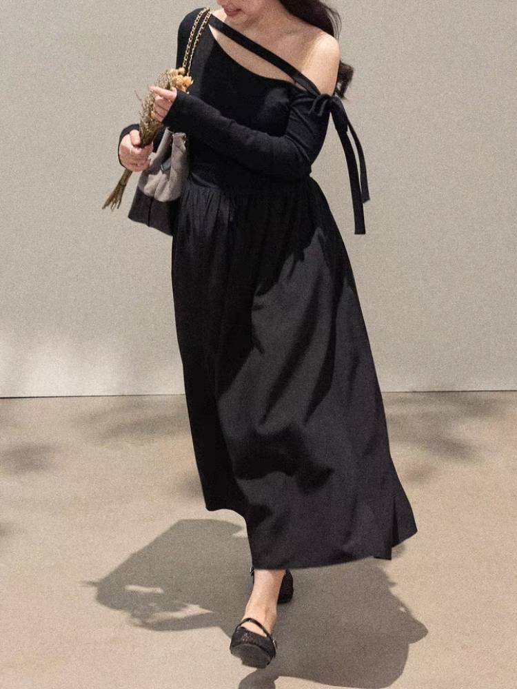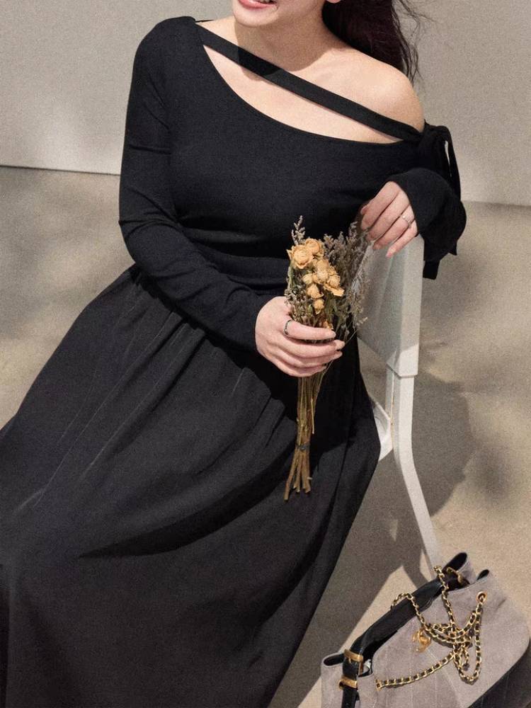 アシンメトリーなワンショルダーデザインが目を惹く、上品なブラックロングワンピース。