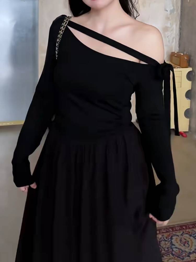 さりげない肌見せで惹きつける ワンショルダーワンピース 可愛い オフショルダー アシンメトリー リボンデザイン デート お呼ばれ 大きいサイズ 韓国 CH11553