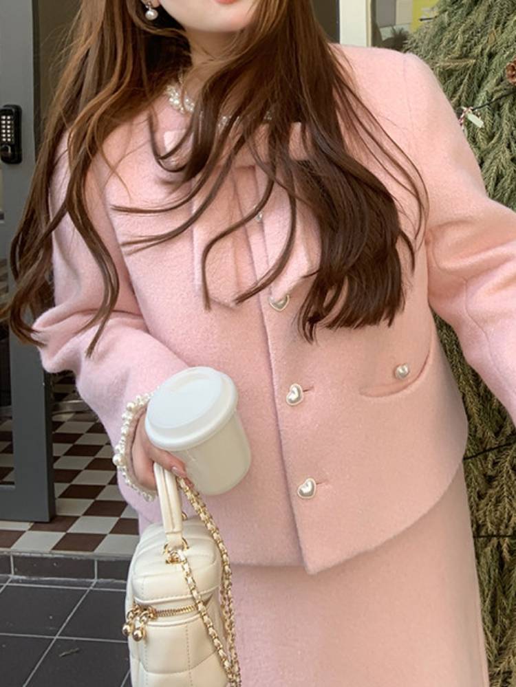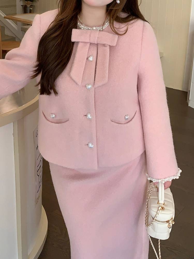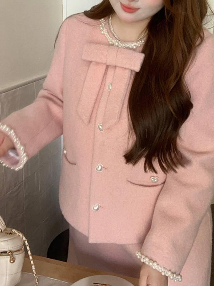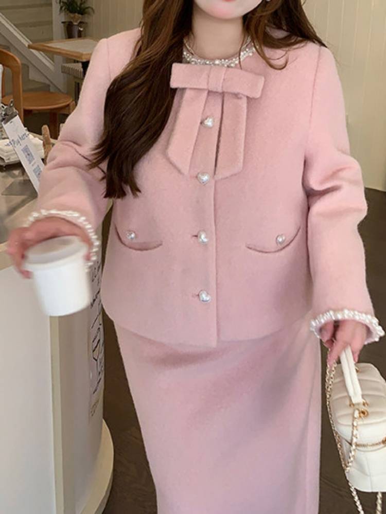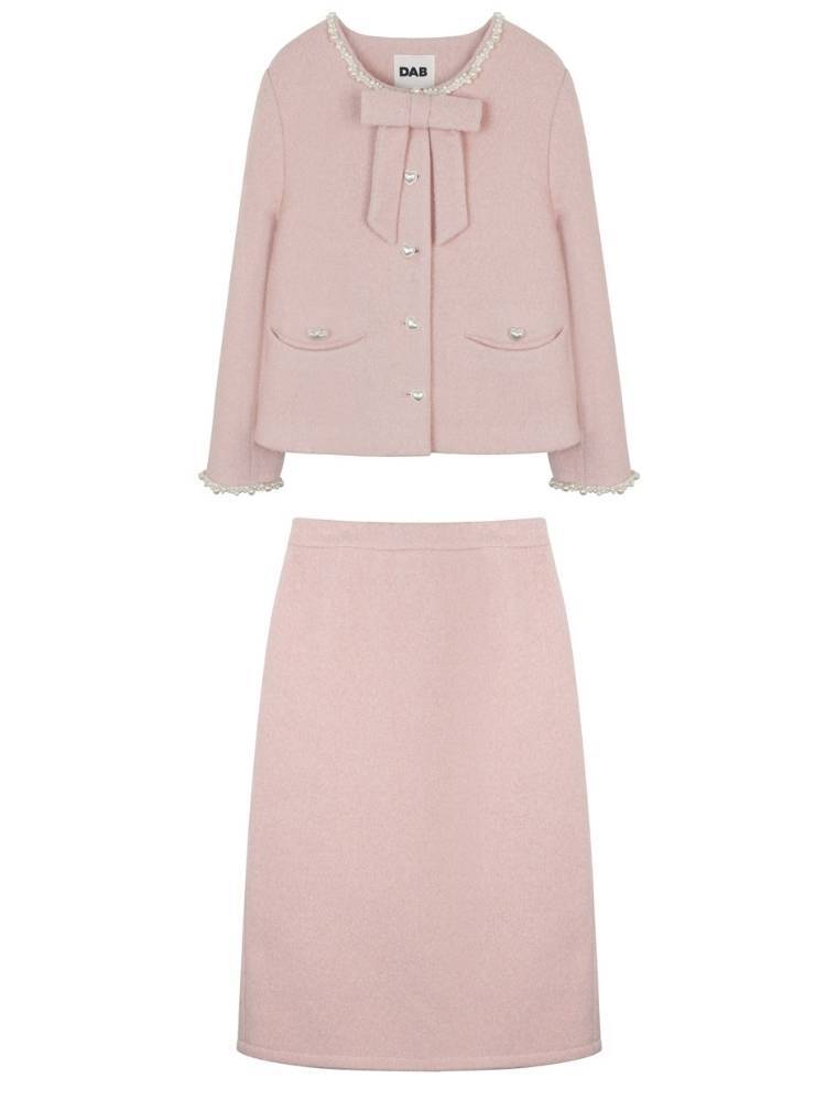 柔らかなピンクカラーが印象的な、リボンデザインジャケットとロングスカートのセットアップ。
