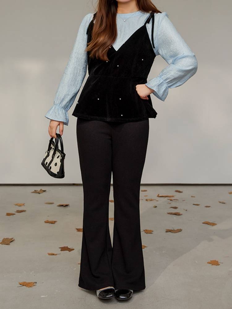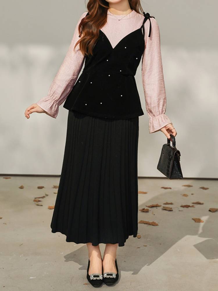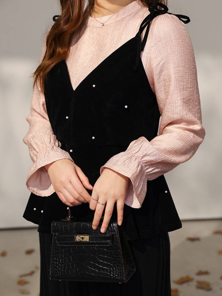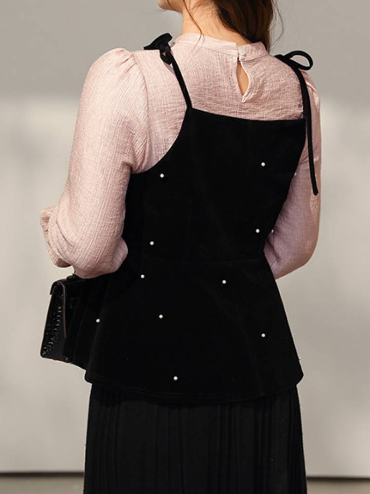 ブラウスにビスチェを重ねたような、