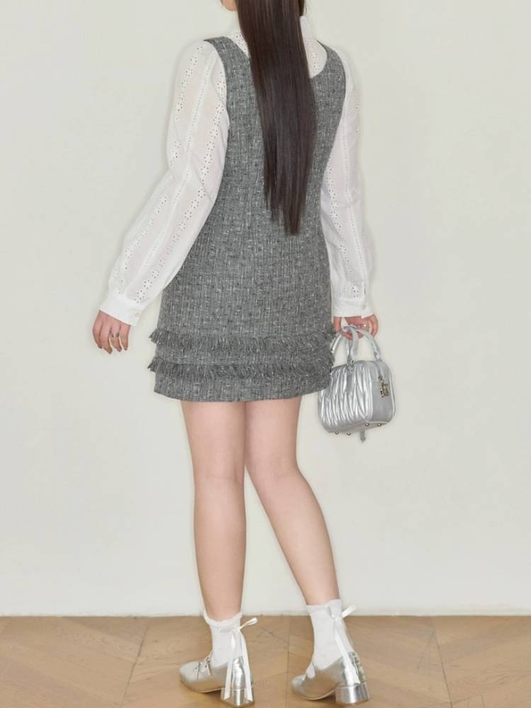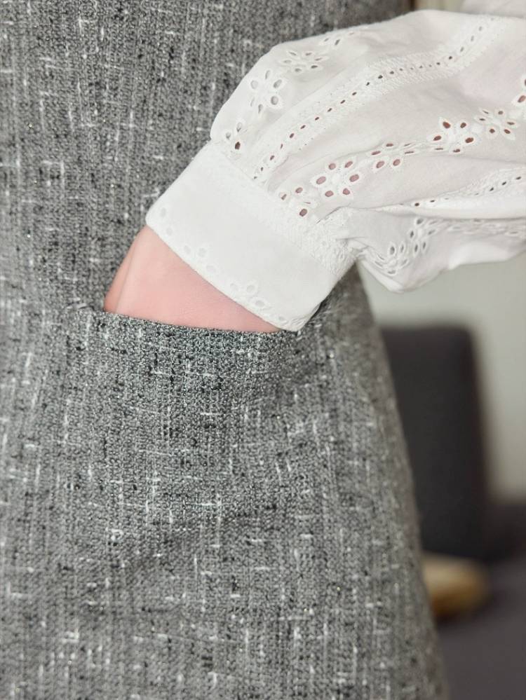 "ツイード風ジャンスカ×白レースブラウス"