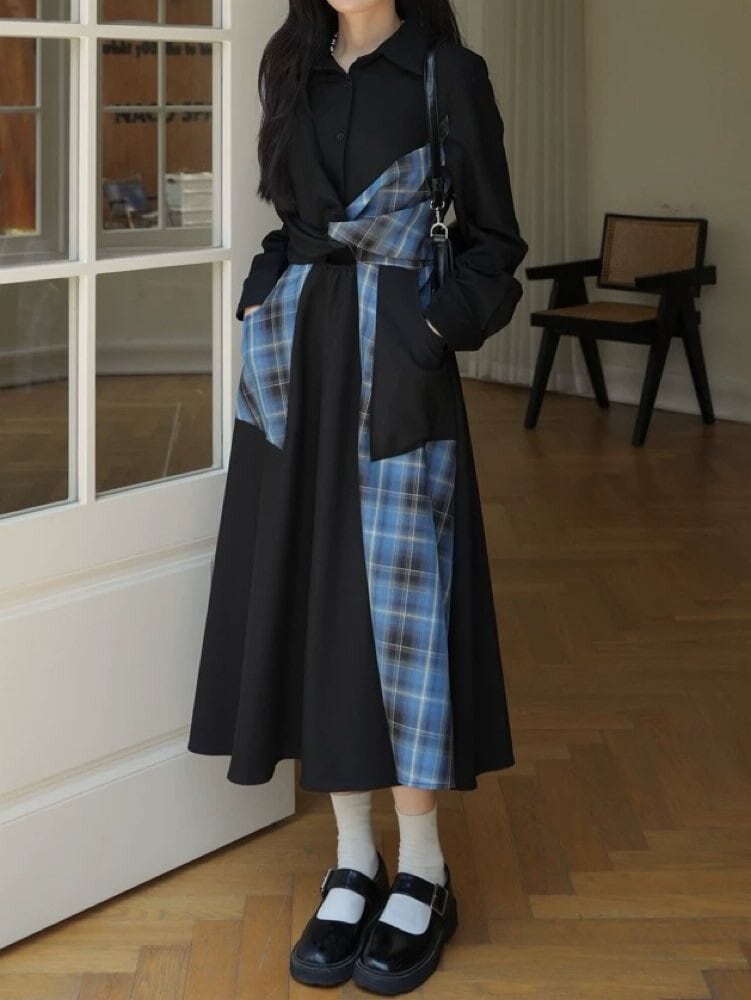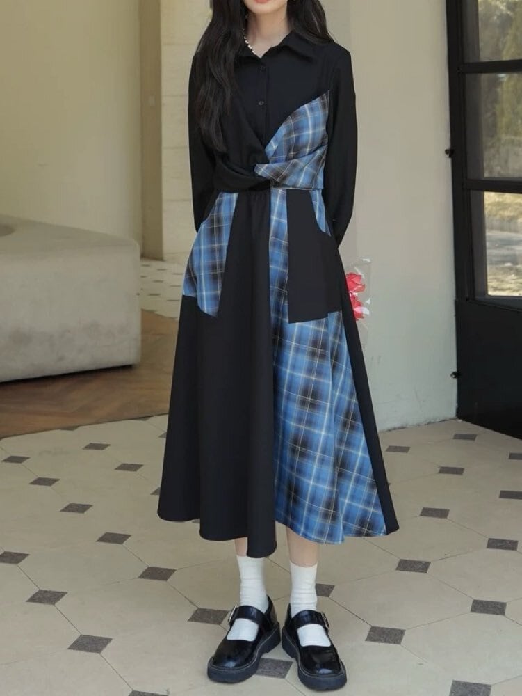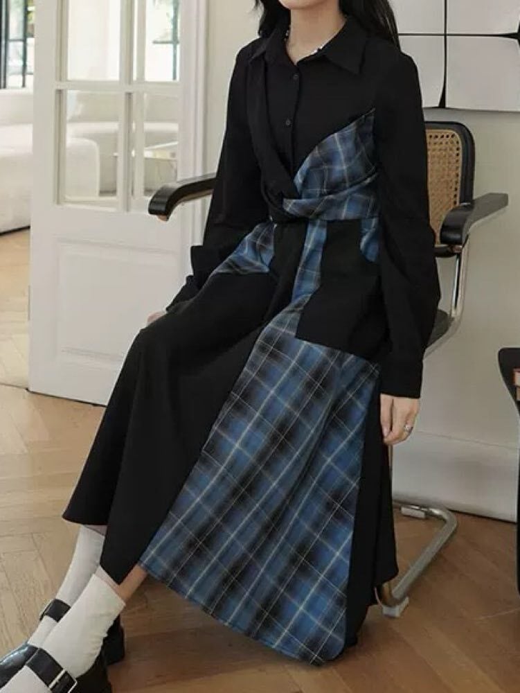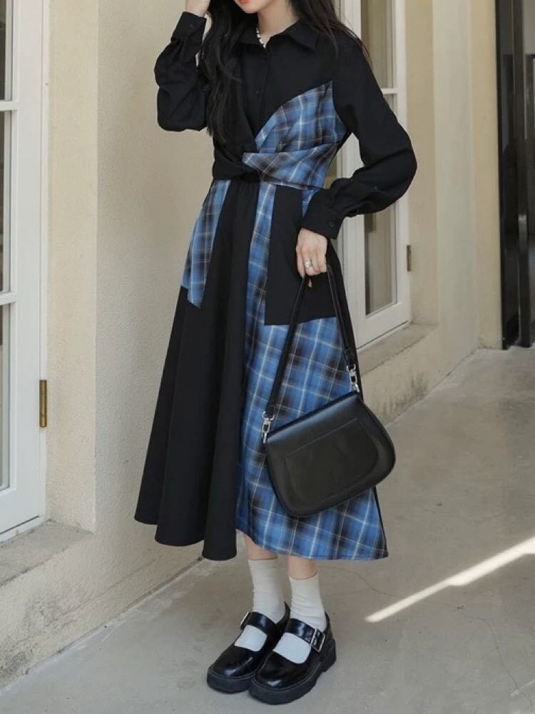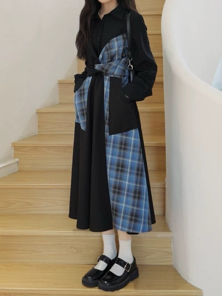 甘さとモードで魅せる配色ワンピ チェックパッチワークシャツワンピース お洒落 大人可愛い チェック柄 モード 着映え リボン こなれ感 くびれ 細見え 体型カバー 大きいサイズ 韓国 CH11533