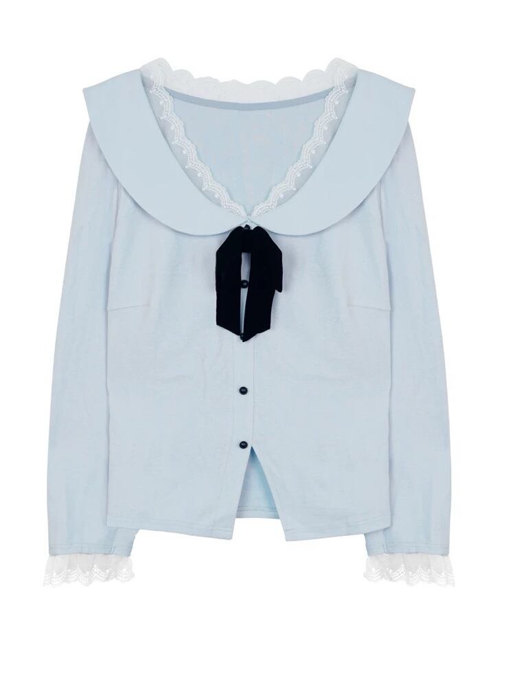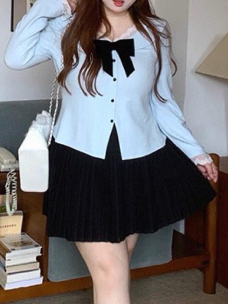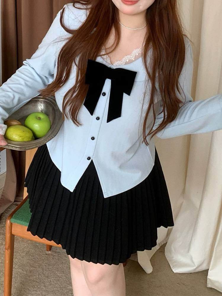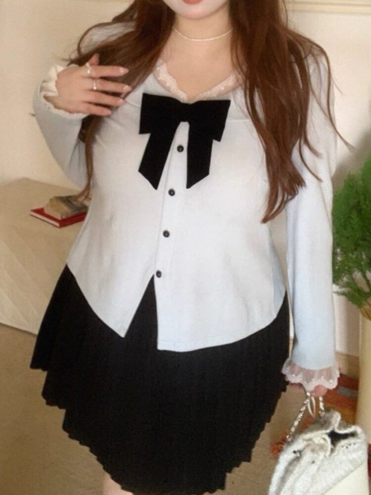 視線集める愛されスタイル 配色リボンVネックトップス 大人可愛い お洒落 着映え レース リボン バイカラー Vネック カジュアル きれいめ デート 細見え 大きいサイズ 韓国 CH11538