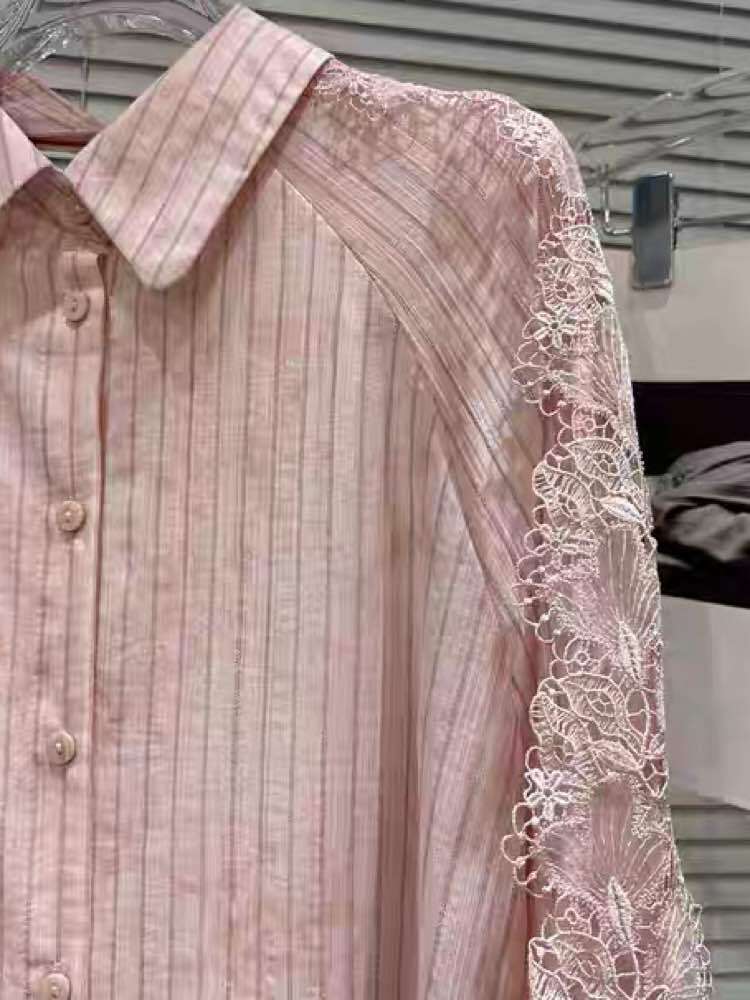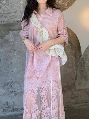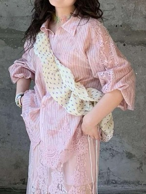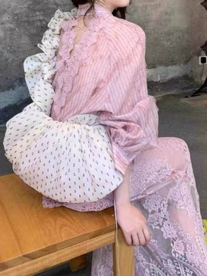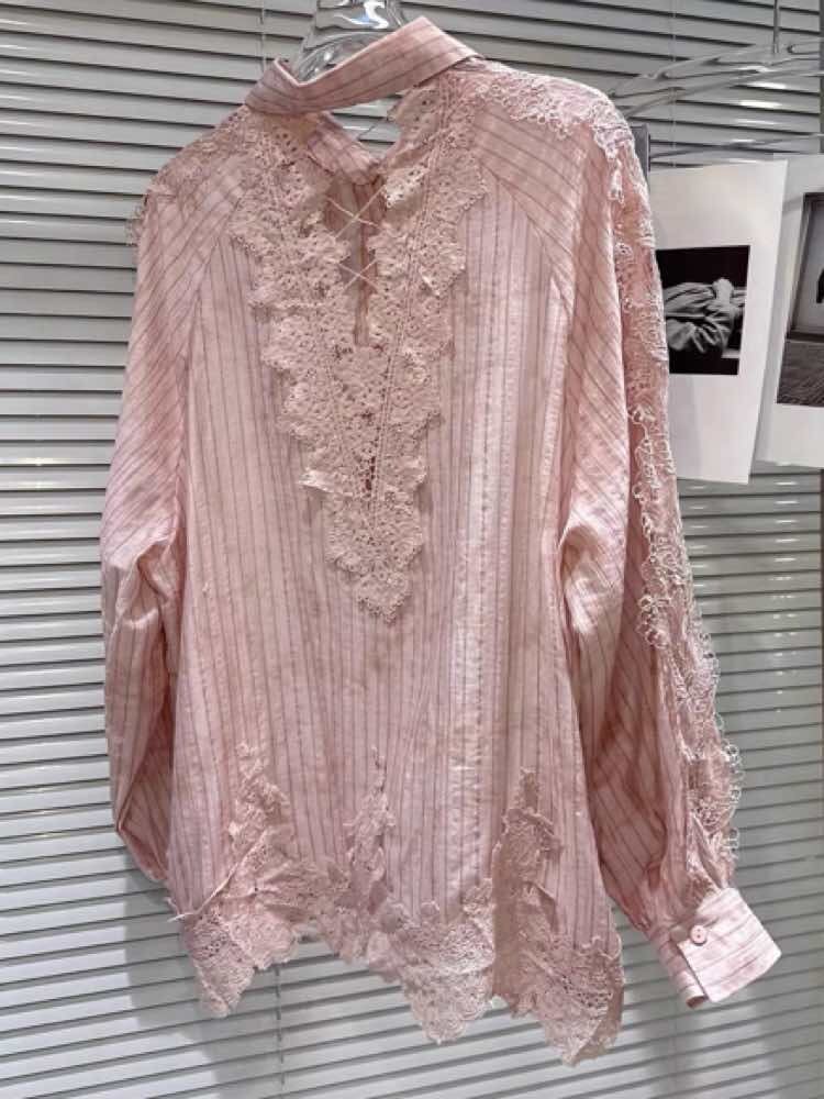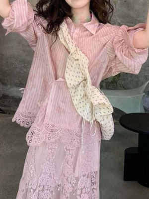 柔らかなピンクのストライプ生地に、贅沢なレースをあしらったレディライクなブラウス♡