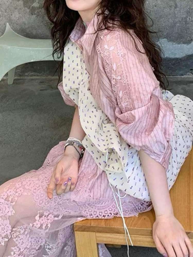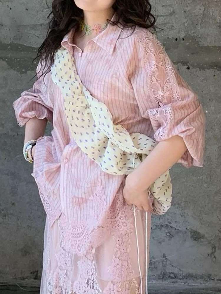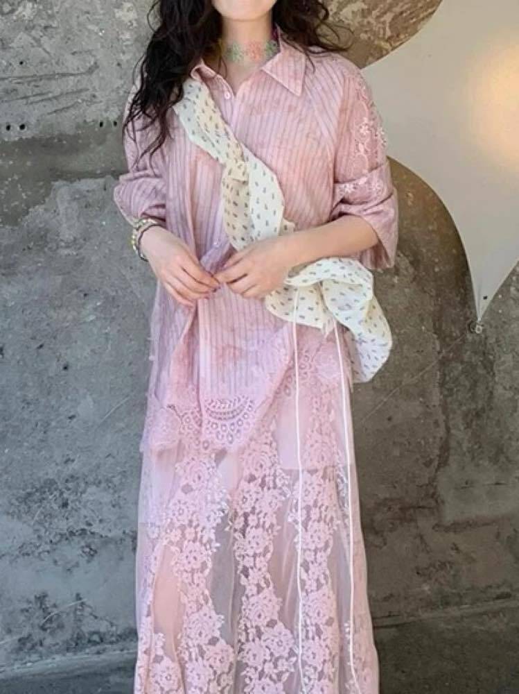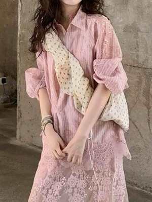 レディライクに華やぐこなれ感 バックカットアウトストライプシアーシャツ 大人可愛い お洒落 シアー レース レースアップ ストライプ こなれ感 トレンド レイヤード カジュアル ガーリー 体型カバー 大きいサイズ 韓国 CH11542