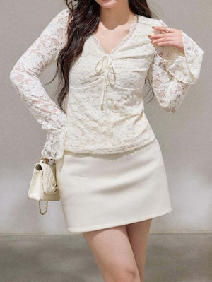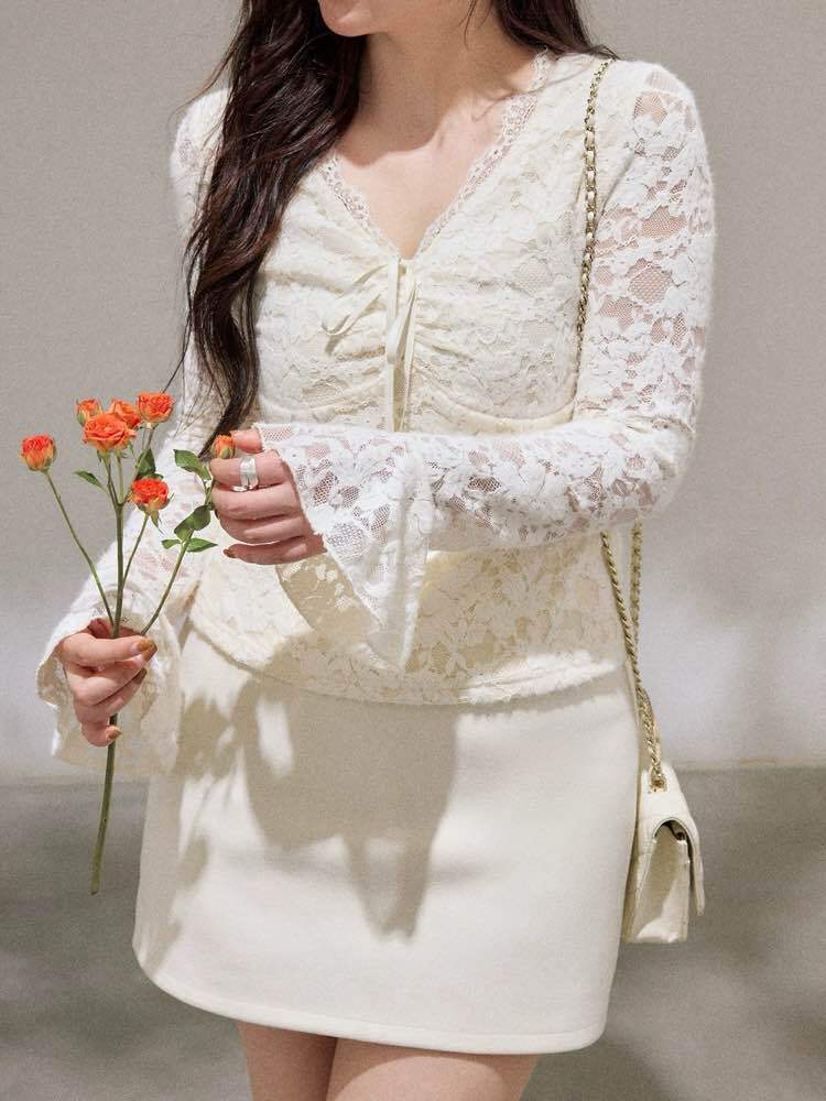 360度どこから見ても着映える Vネック総レーストップス 大人可愛い お洒落 レース シアー リボン 肌見せ こなれ感 きれいめ カジュアル フェミニン 体型カバー 大きいサイズ 韓国 CH11547
