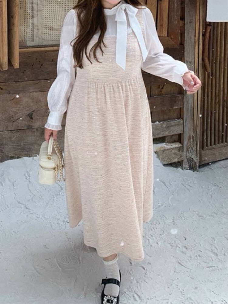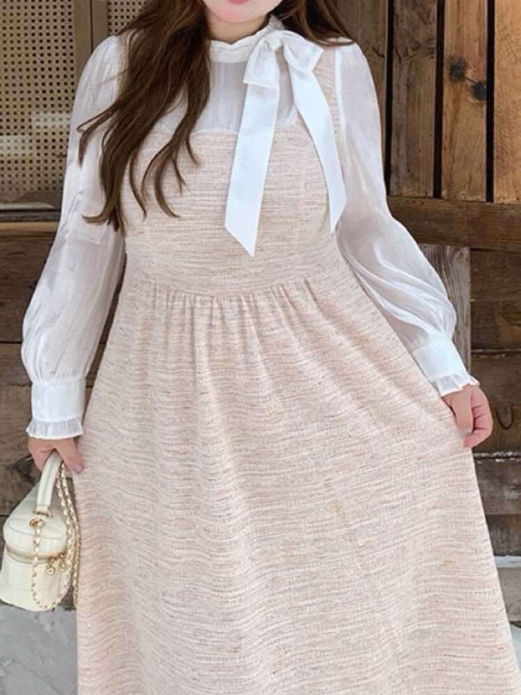 淡いミックスカラーが大人可愛い ブラウスドッキングツイードワンピース お洒落 大人可愛い ツイード シャーベットカラー 上品 リボン お呼ばれ オケージョン 体型カバー 大きいサイズ 韓国 CH11550