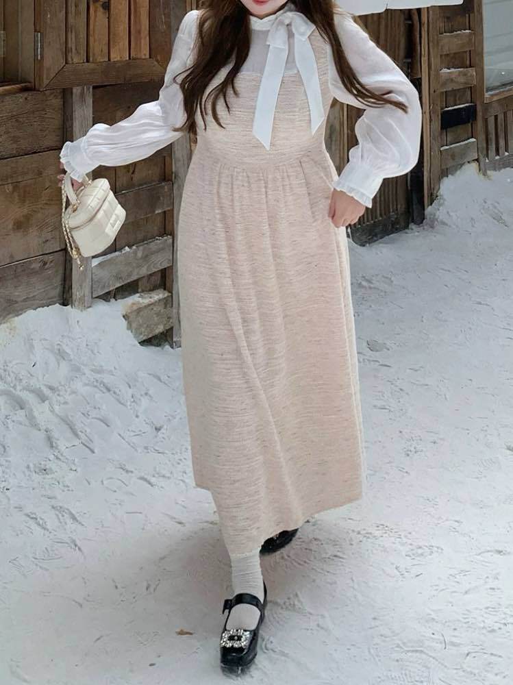 高めのウエスト位置切り替え&首元の大きなリボンが視線を上げてくれるので、スタイルアップ効果もバツグン◎