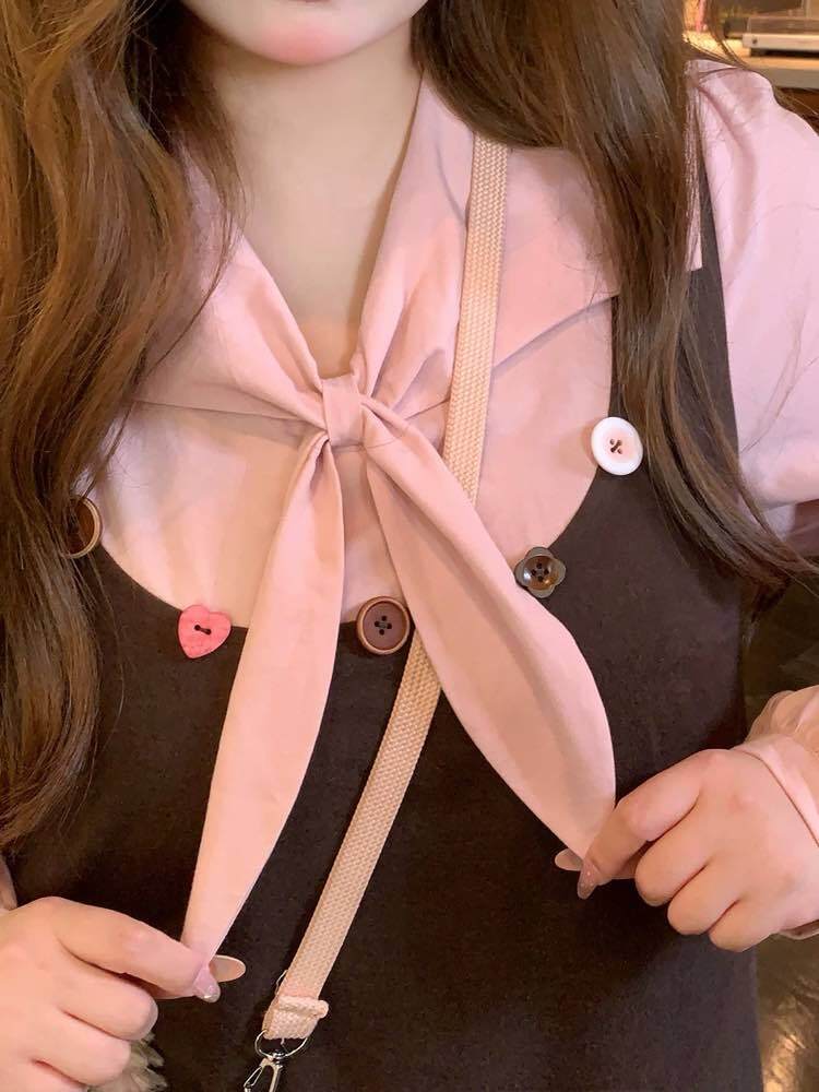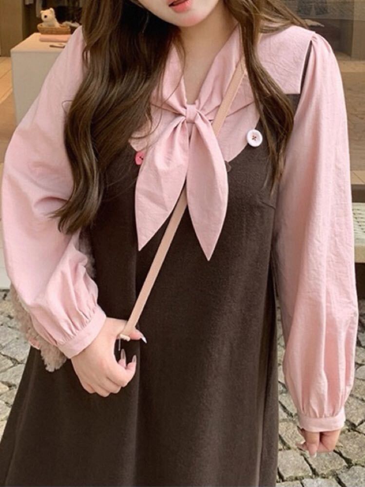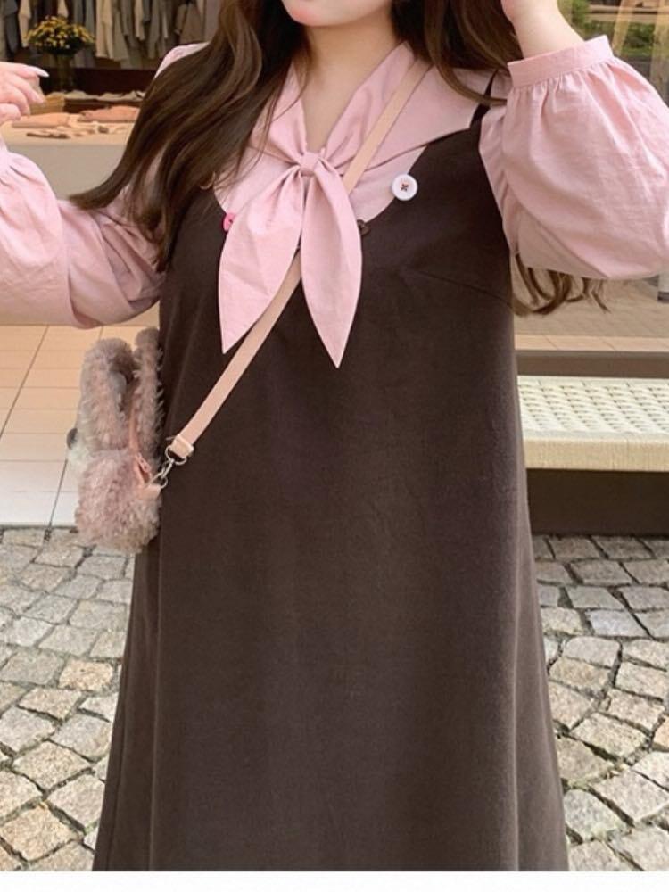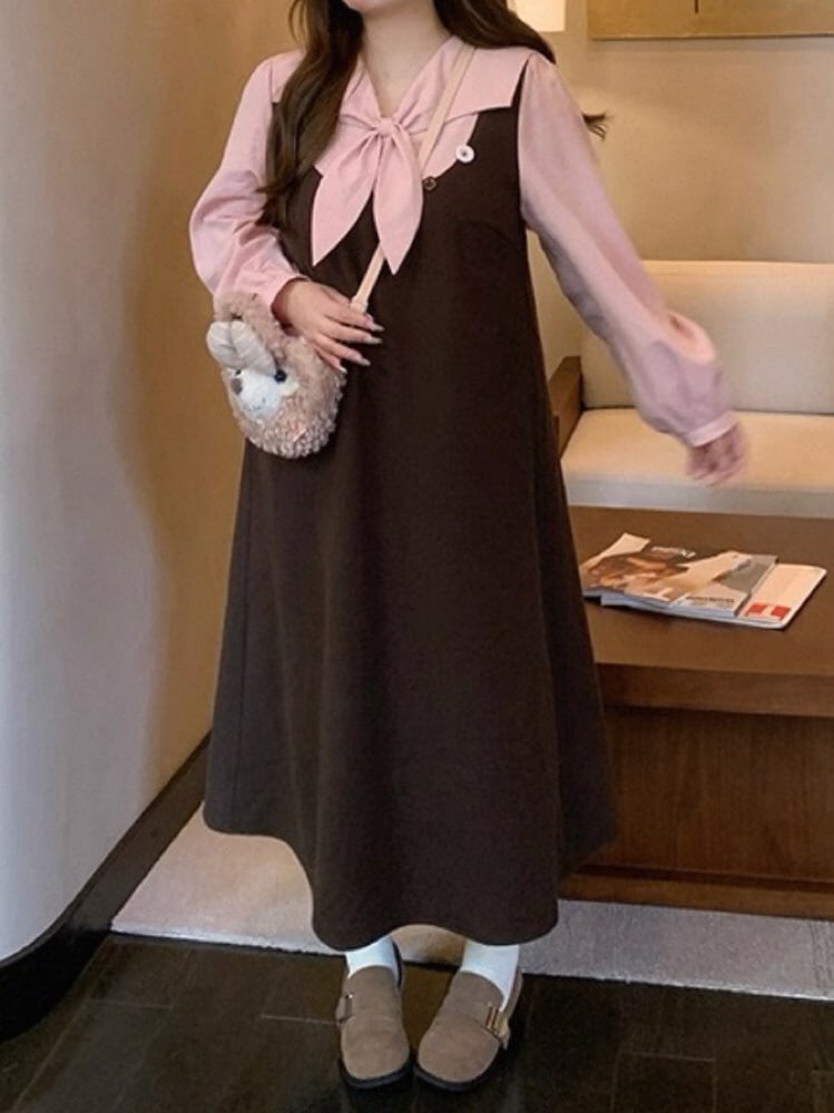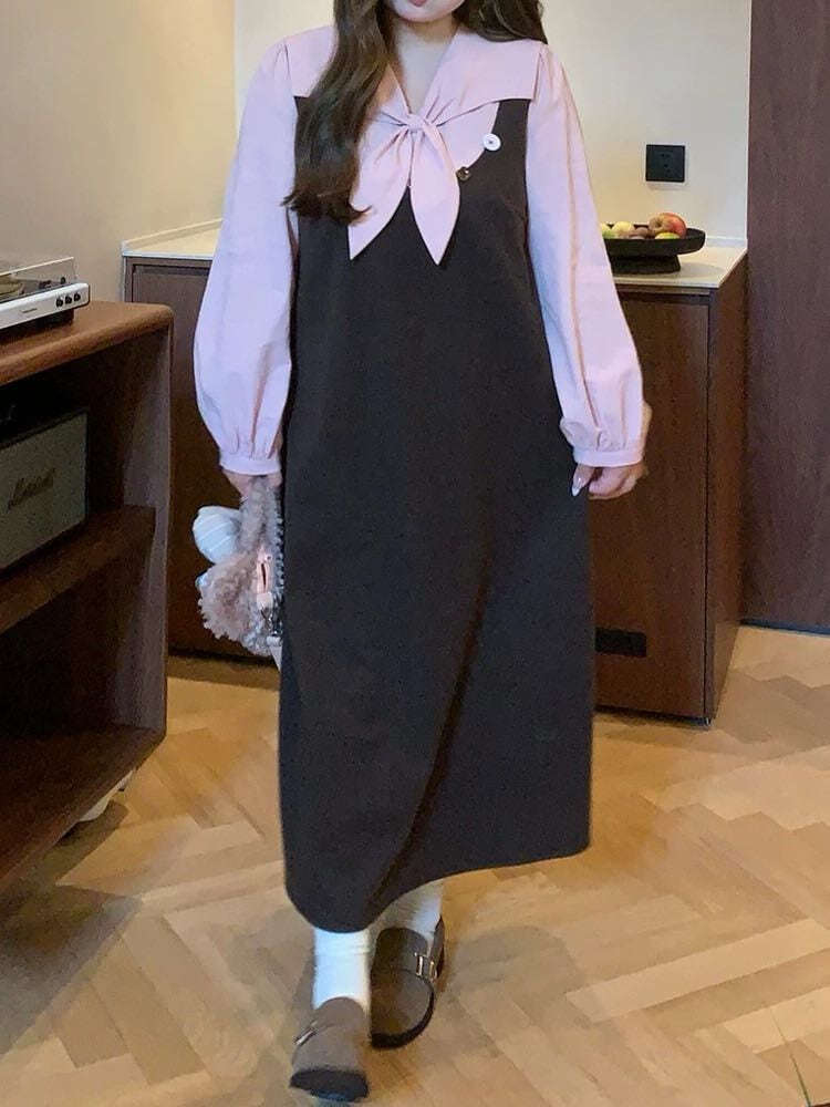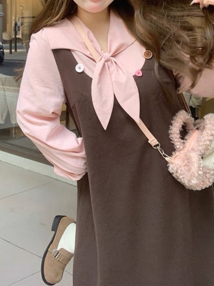 視線惹きつける主役な1着 ボタン装飾セーラー襟ワンピース お洒落 大人可愛い ハート 花 バイカラー リボン 上品 クラシカル レイヤード風 体型カバー 大きいサイズ 韓国 CH11543