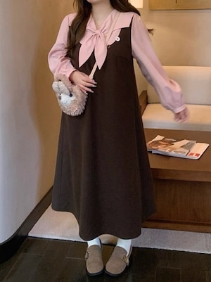 ブラウスをレイヤードしたようなデザインが目を惹く、大人かわいいドッキング風のワンピースです♡