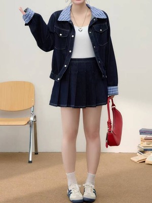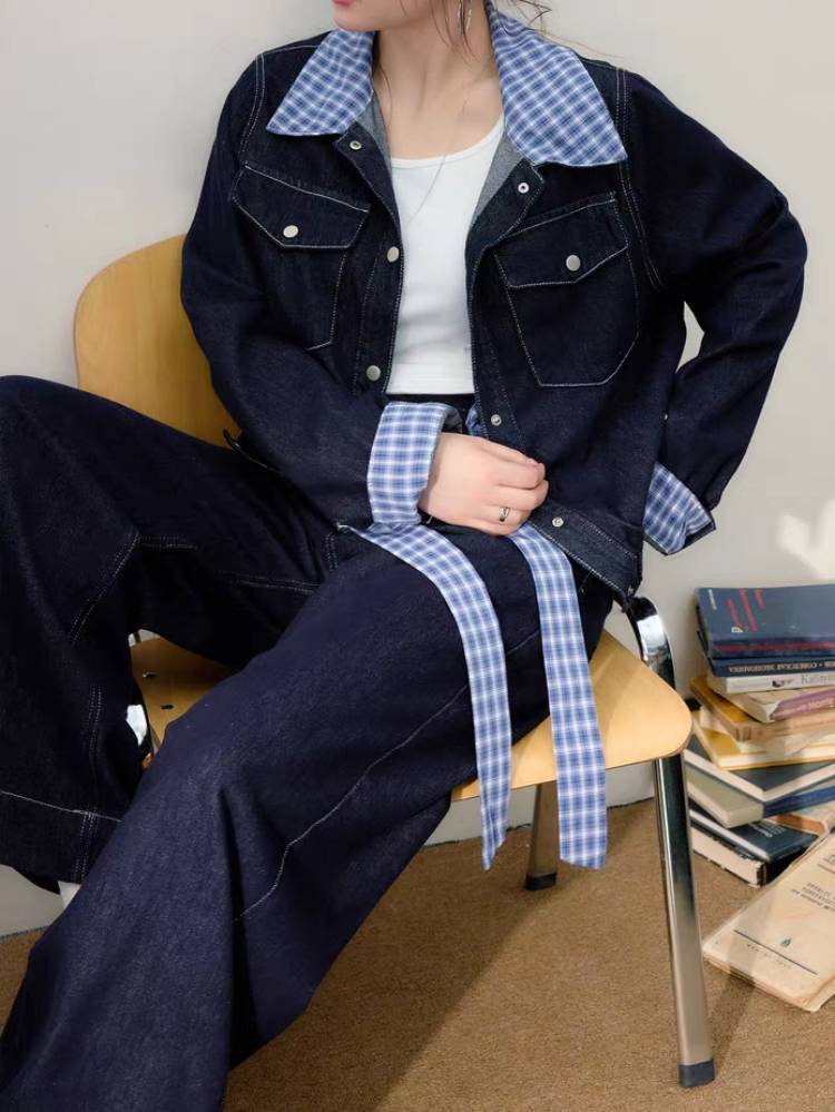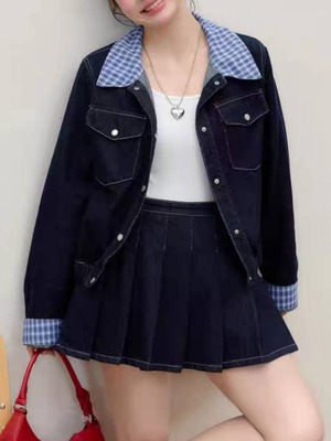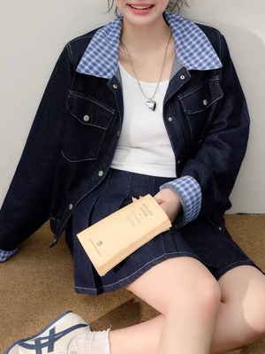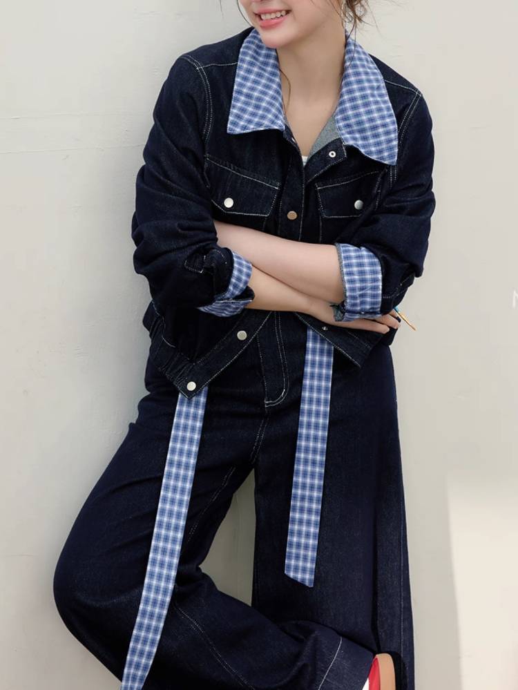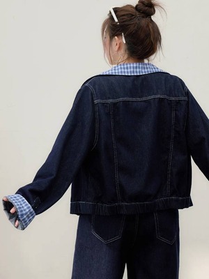 ベーシックな濃紺デニムに、ギンガムチェックの襟&袖口をプラスした遊び心あるデザイン。