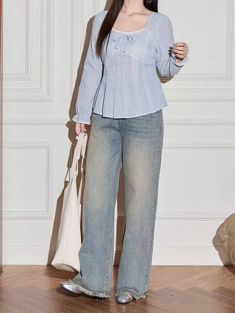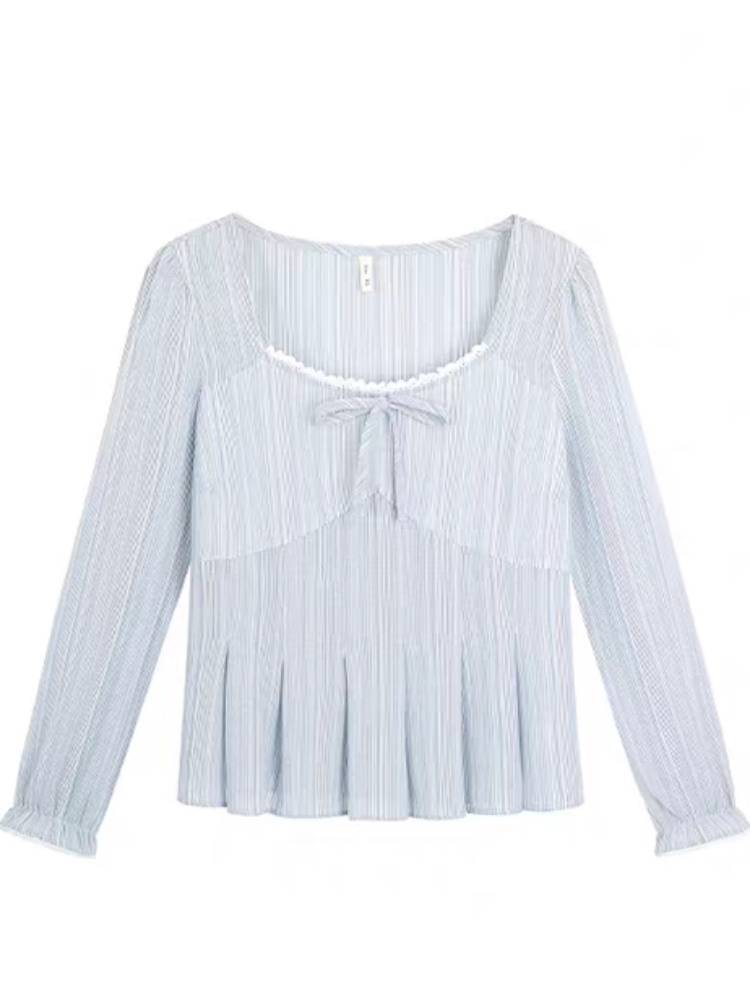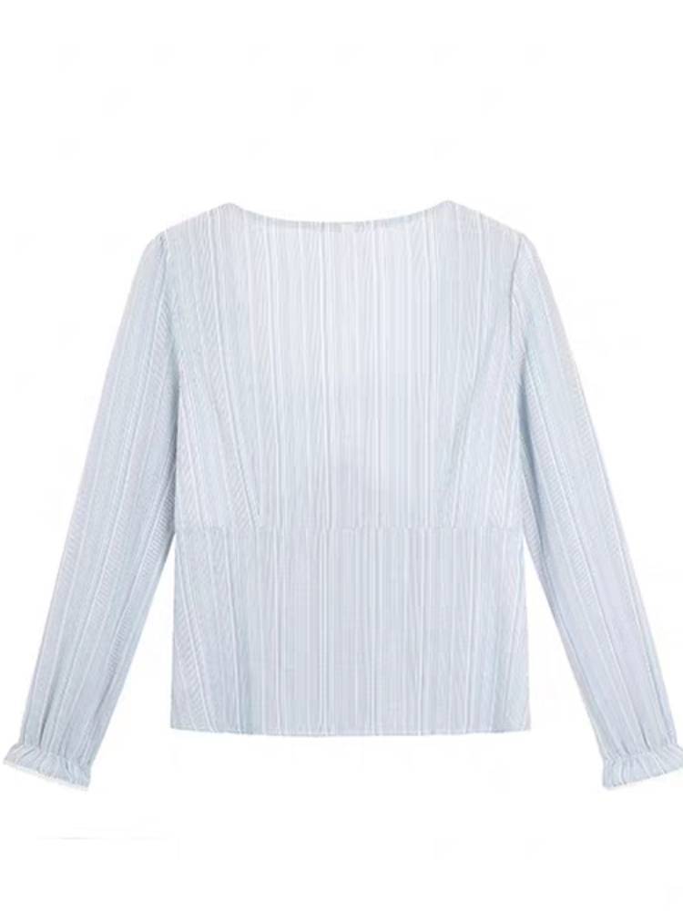 淡いブルーが柔らかく上品な印象を与えるフェミニンブラウス。