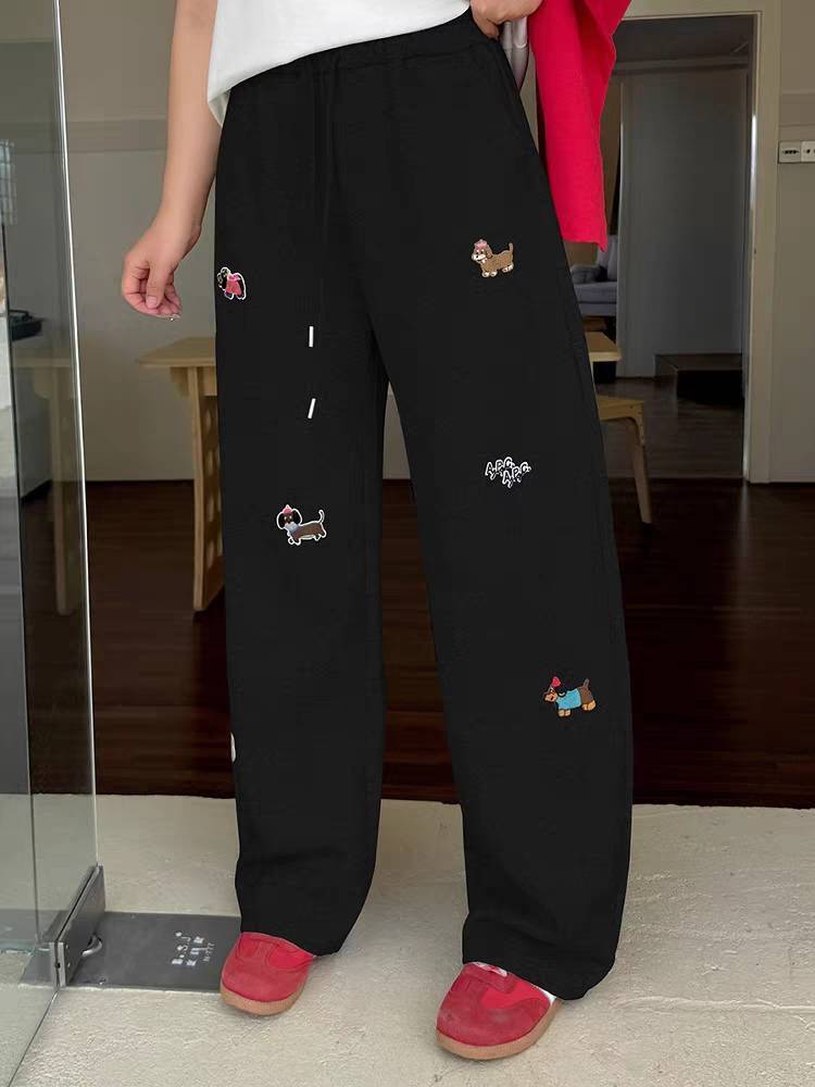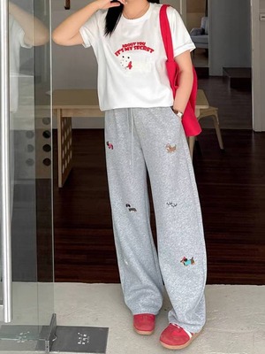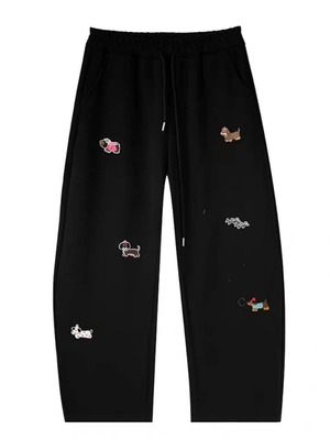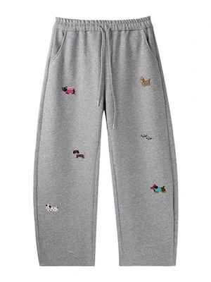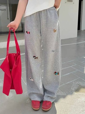 リラックス感たっぷりのワイドシルエットに、遊び心のある犬刺繍を散りばめた大人可愛いスウェットパンツ。