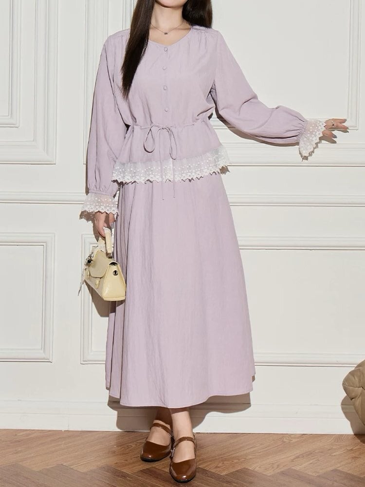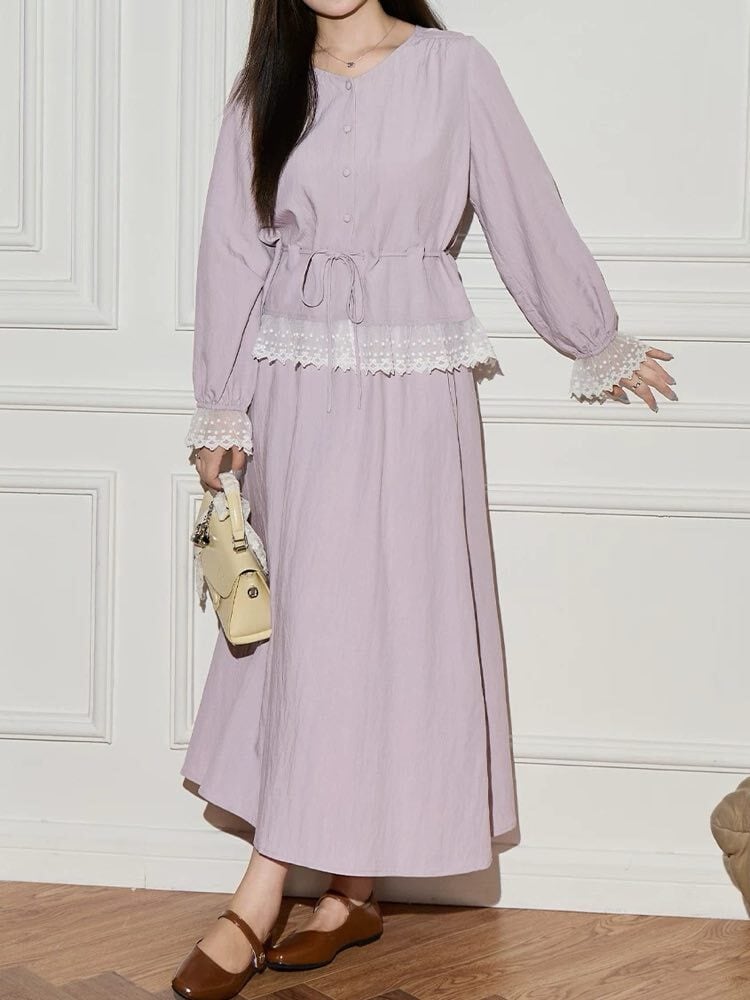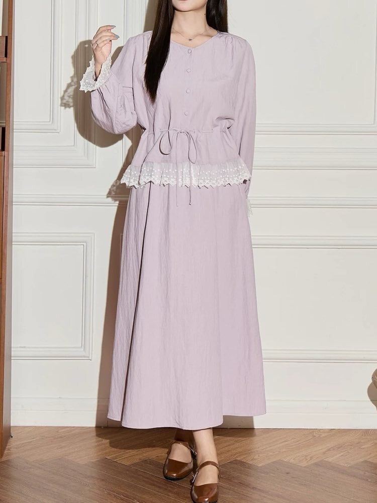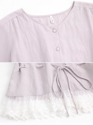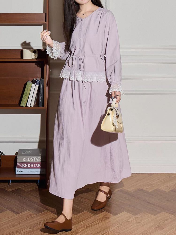ナチュラルに上品見え ウエストマークノーカラーブラウスセットアップ 2点セット 大人可愛い 上品 レース おしゃれ きれいめ フェミニン ノーカラー ロング丈 くびれ 体型カバー 大きいサイズ 韓国 CH11597