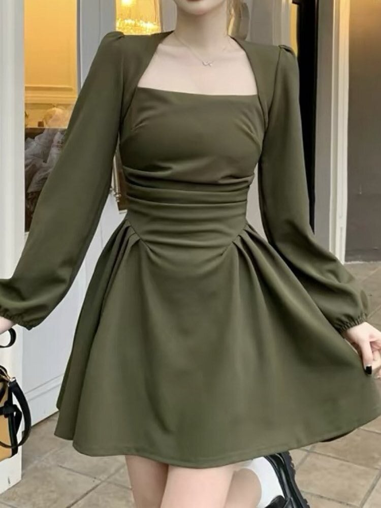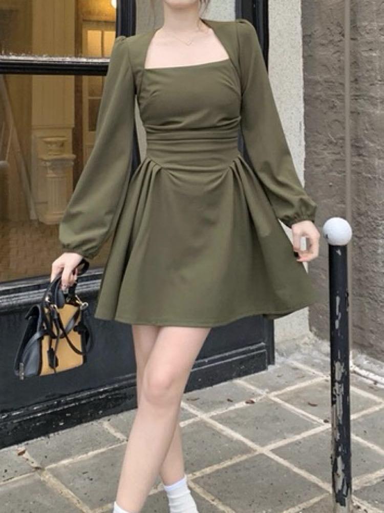 ウエストマークでスタイル格上げ ウエストギャザーミニワンピース おしゃれ 大人可愛い 上品 ワントーン スクエアネック 洗練 カーキ ミニ丈 くびれ 細見え 体型カバー 大きいサイズ 韓国 CH11589