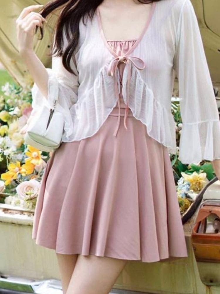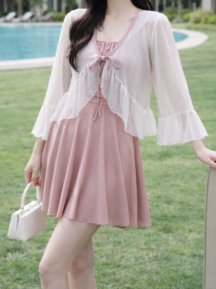 大人かわいい シアー羽織付きワンピース水着 ブラック ピンク 体型カバー フリル袖 ウエスト切替 2点セット 大きいサイズ 韓国 CH11647