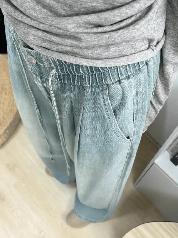 涼しくて軽い デニム風ワイドパンツ 夏向け ひんやり 落ち感 ゆるシルエット 体型カバー 大きいサイズ 韓国 CH11650