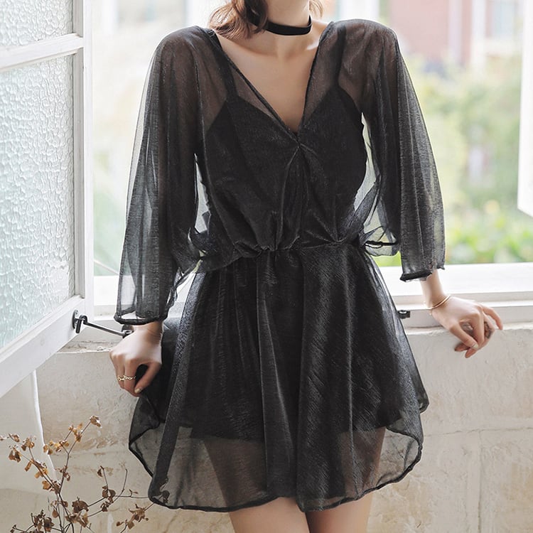 ワンピース風のセパレート水着にシアー素材のラッシュガードが付属した3点セット。
