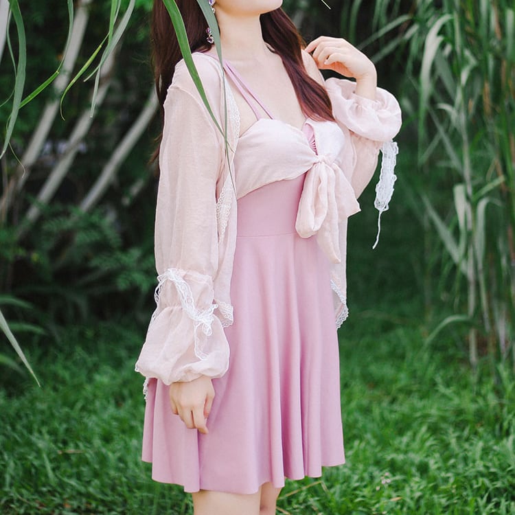 シフォン素材のくしゅくしゅスリーブや、胸元のリボンが可愛らしさをプラスした、体型カバー抜群の水着セットが登場♩
