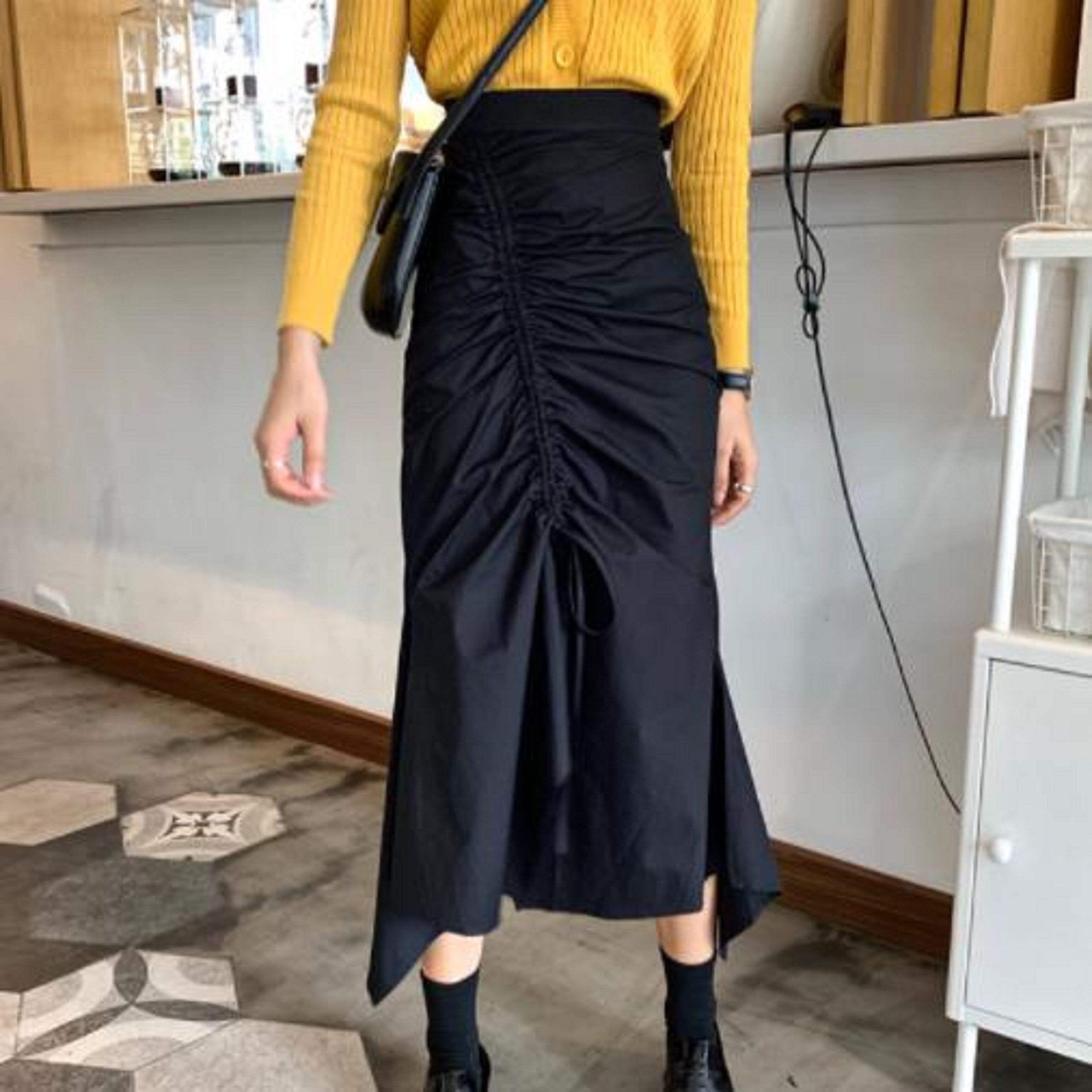 ハイウエスト ミドル丈 スカート ブラック 無地 大きいサイズ 韓国 CH1374