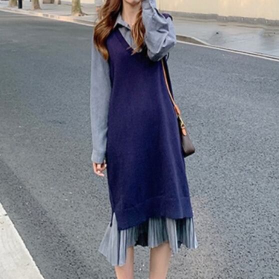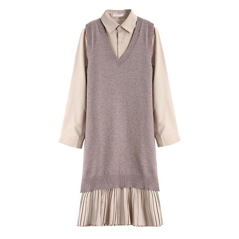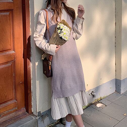 シンプルスタイルに今っぽさをプラス シャツワンピ&ニットベスト 2点セット オルチャン 大きいサイズ 韓国 CH1663