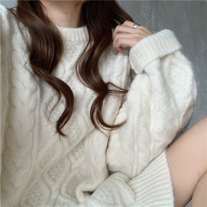 トレンドのオーバーサイズデザインのケーブル編みニット。