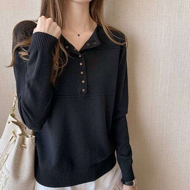 カジュアルにもきれいめにも ボタン付きシンプルニット スクープネック 長袖 無地 ショート丈 カジュアル 大きいサイズ 韓国 CH3347