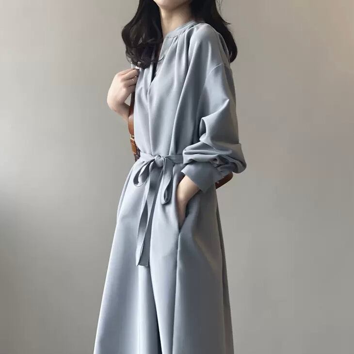 リボン付きワンピース フレンチスタイル ドレス 無地 長袖 Vネック ミディ丈 Aライン レトロ ベージュ ヘイズブルー 大きいサイズ 韓国 CH3387