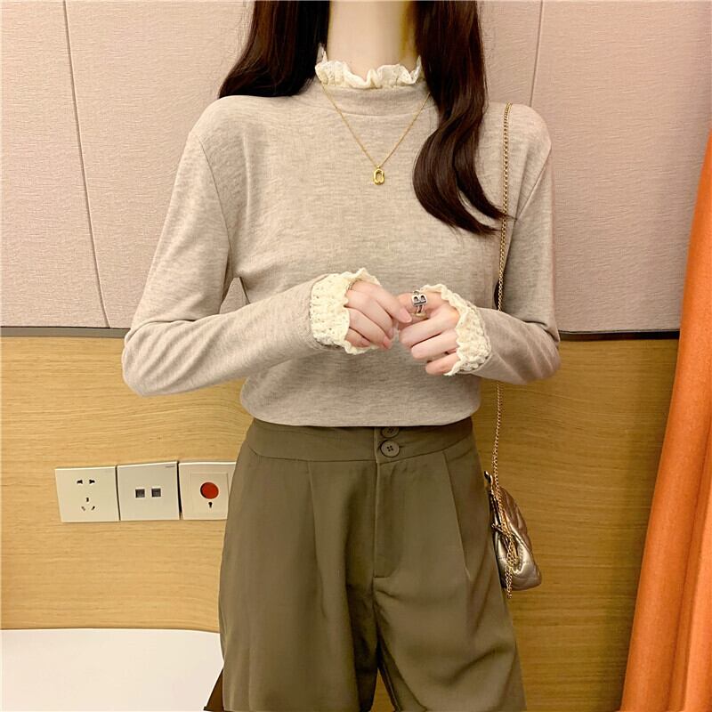 レース付暖かカットソー シンプル 長袖 フリルネック 大きいサイズ 韓国 CH3397
