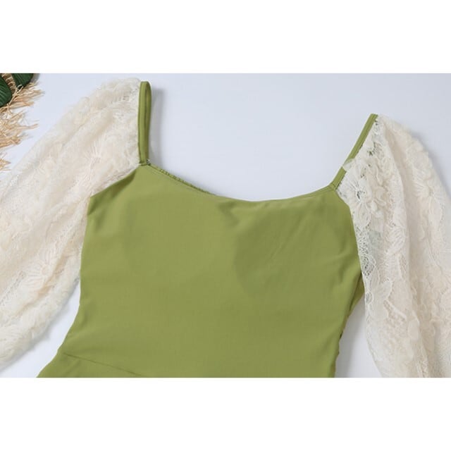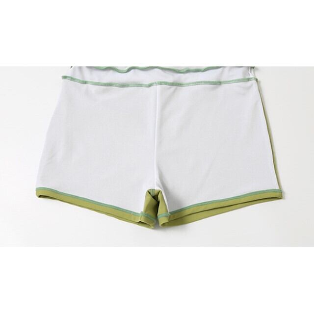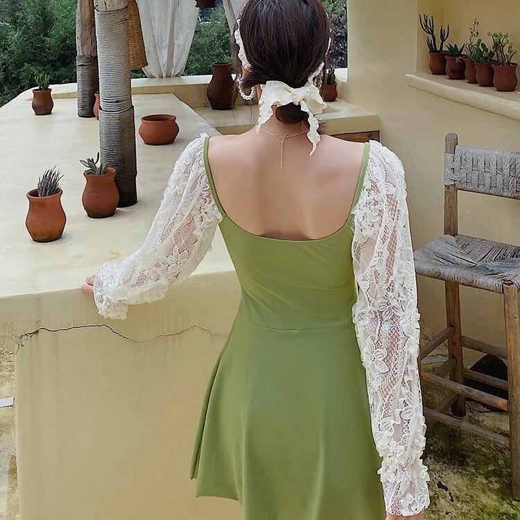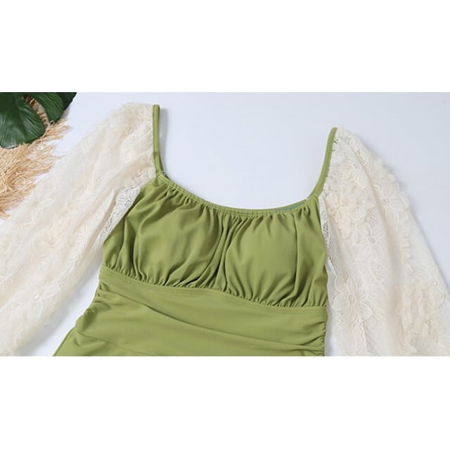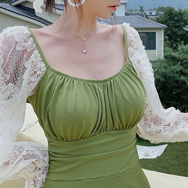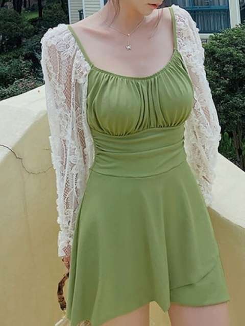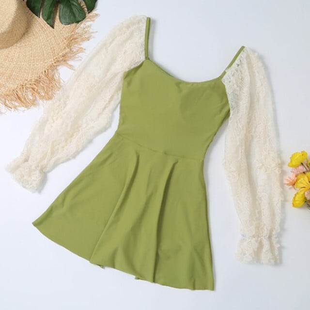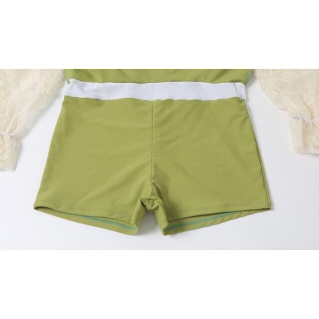 【即納】1点限定 ワンピース水着 レーススリーブ付 ボクサーパンツ フレアスカート 体型カバー 大きいサイズ 韓国 CH3474