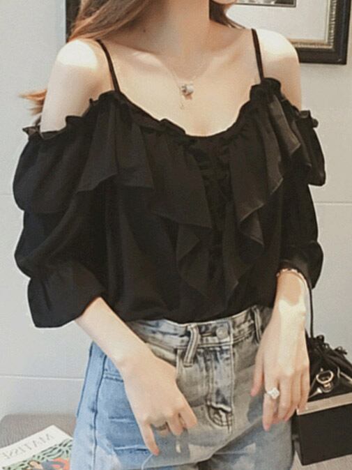 胸のフリルとパフスリーブで身体のラインを隠し、鎖骨を出すことで華奢見えします◎