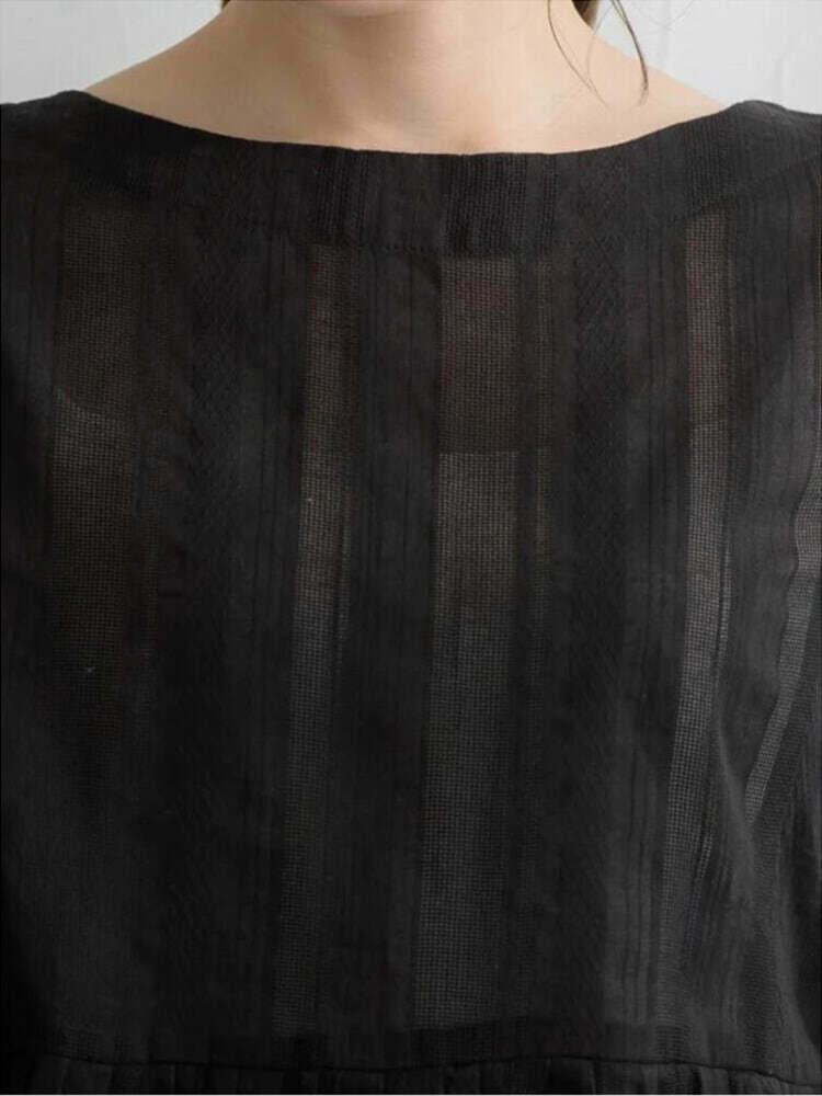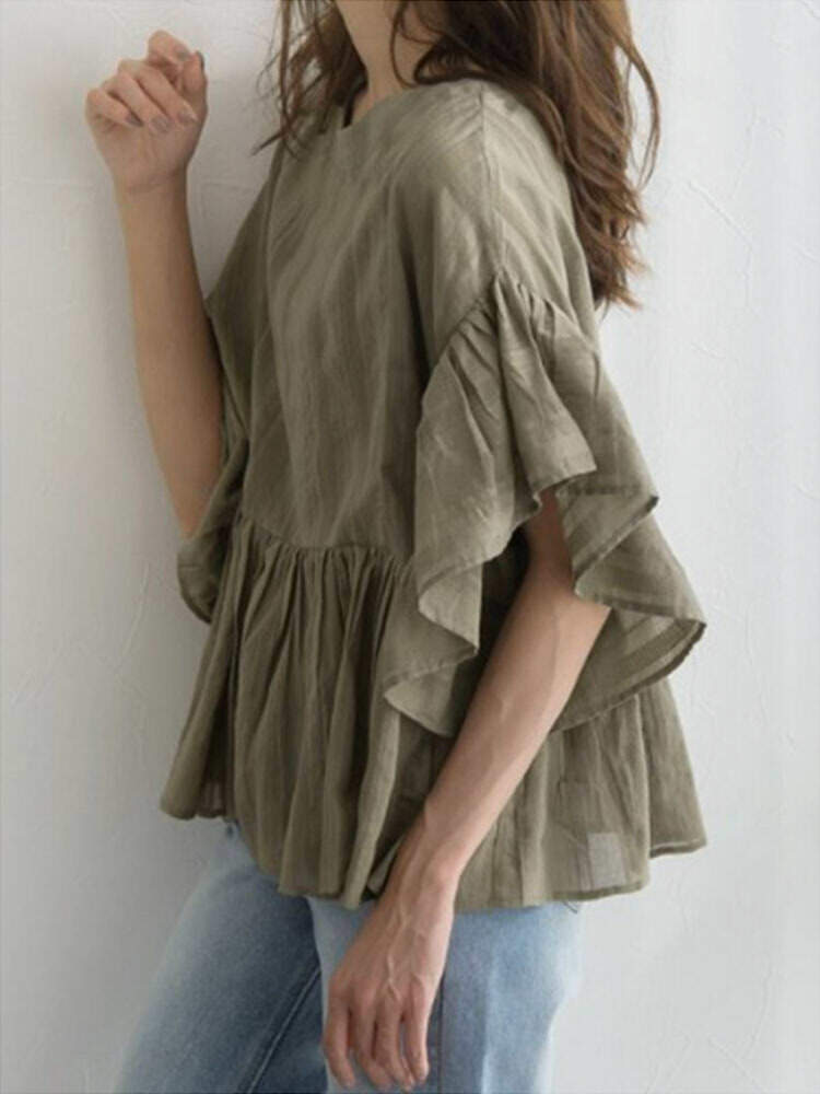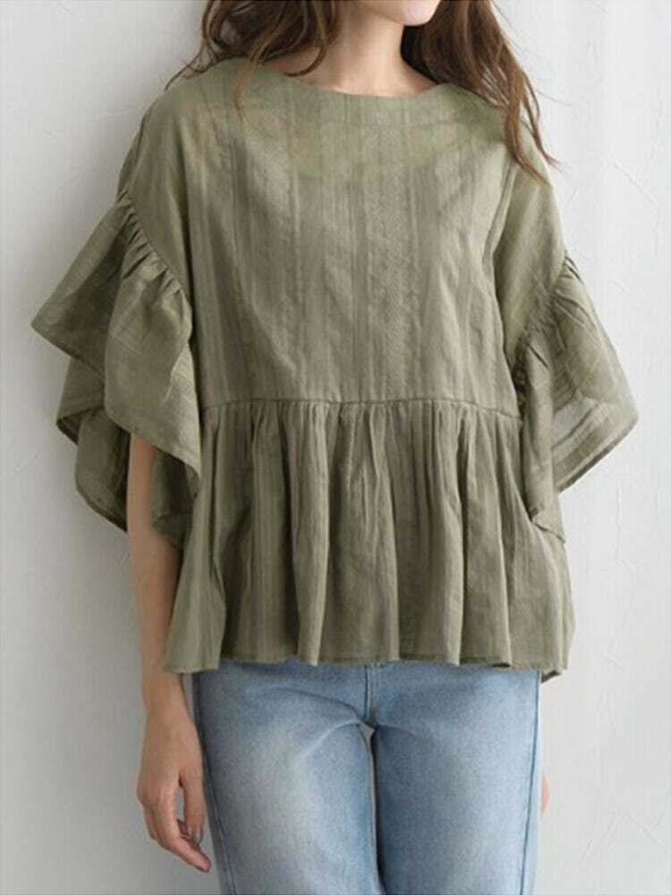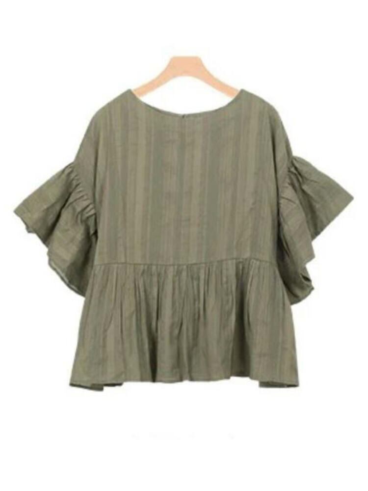 ラウンドネックのすっきりさと、袖と裾にたっぷりあしらわれたフリルのコントラストで華奢見え効果あり!