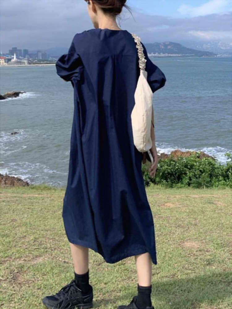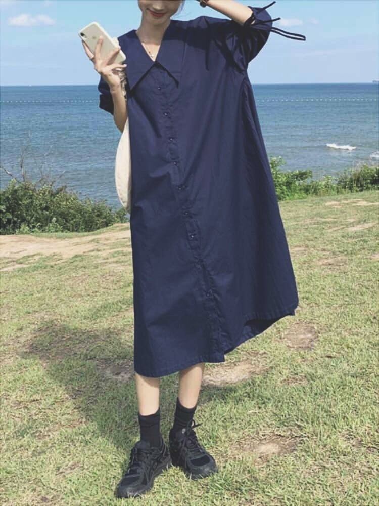 ドロスト袖ロングシャツワンピース カジュアルコーデ かわいい 半袖 リボン人気 大きいサイズ 韓国 CH4481