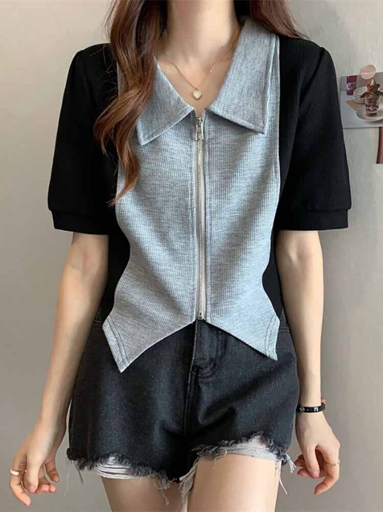 バイカラー切り替えフロントファスナートップス カジュアル 襟付き 半袖 カットソー 大きいサイズ 韓国 CH4545