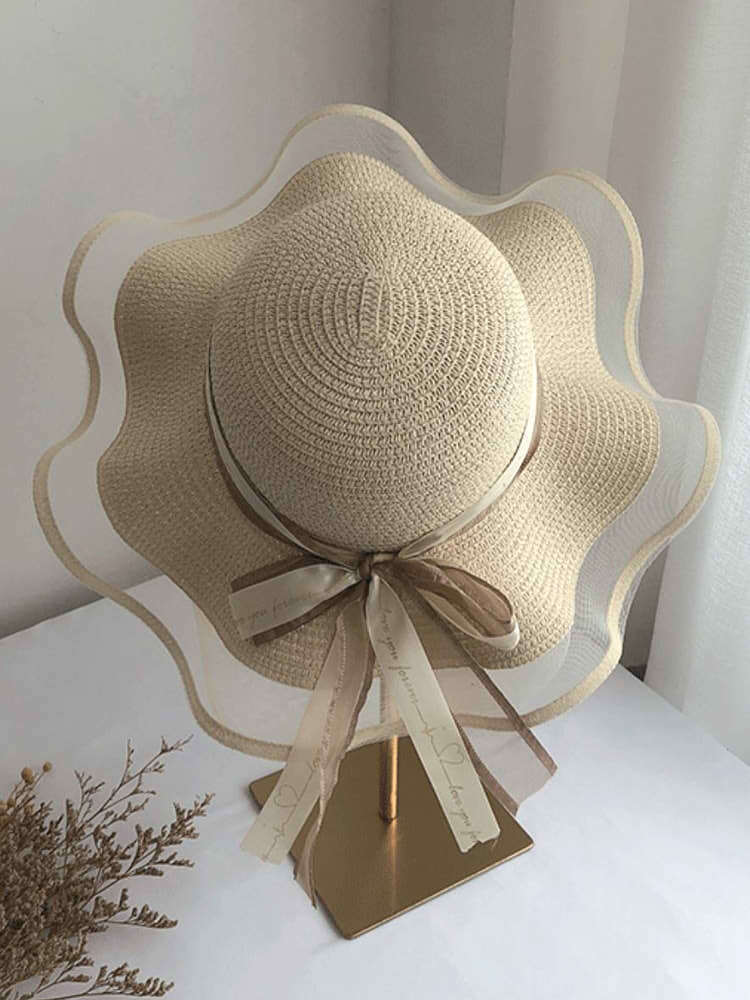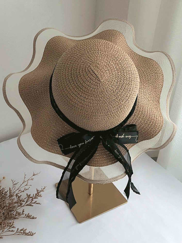 "異素材ウェーブつば広麦わら帽子"