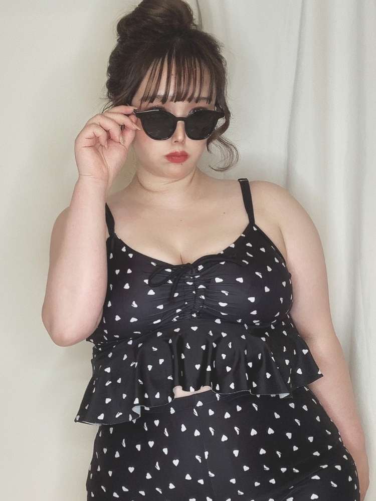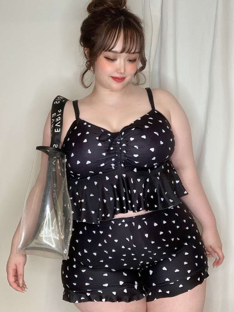 控えめなフリルやブラックにホワイトのハートドット柄がキュートでガーリーなデザイン♡