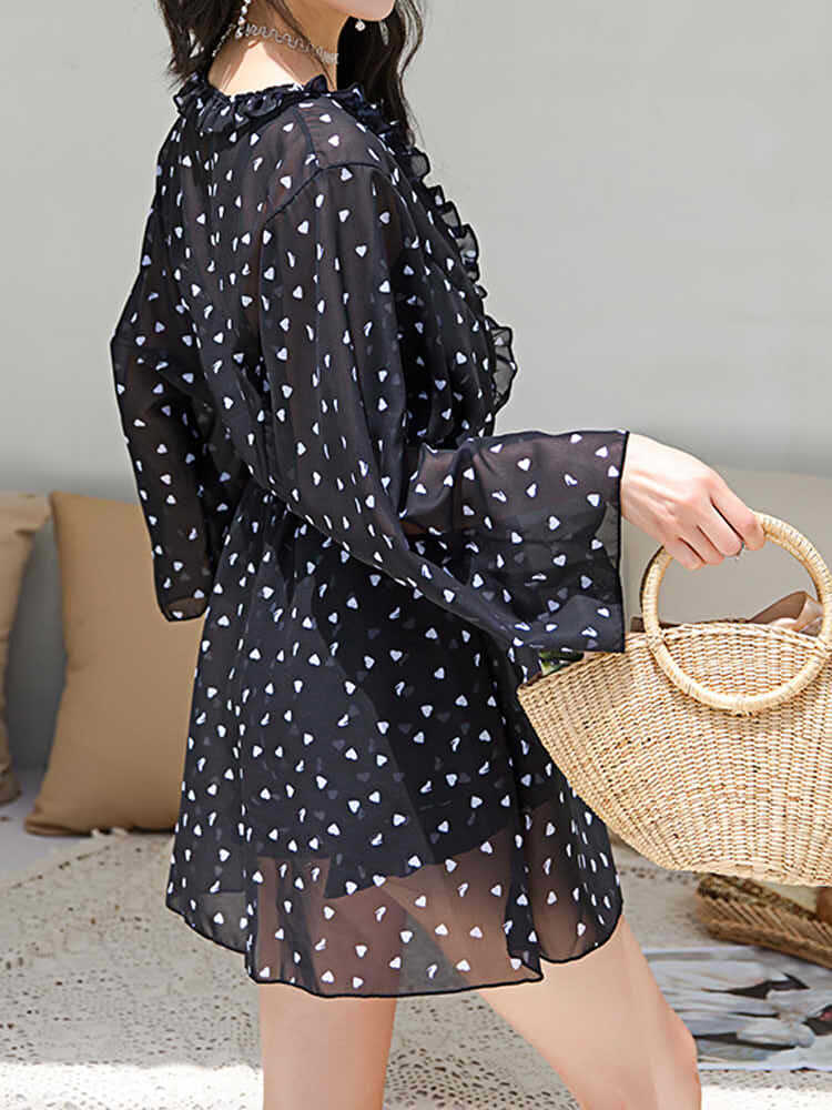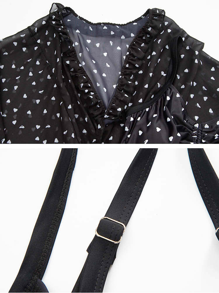 ハートドット柄スリーピース水着 ラッシュガード付 ハイウエスト フリル 体型カバー 大きいサイズ 韓国 CH4906