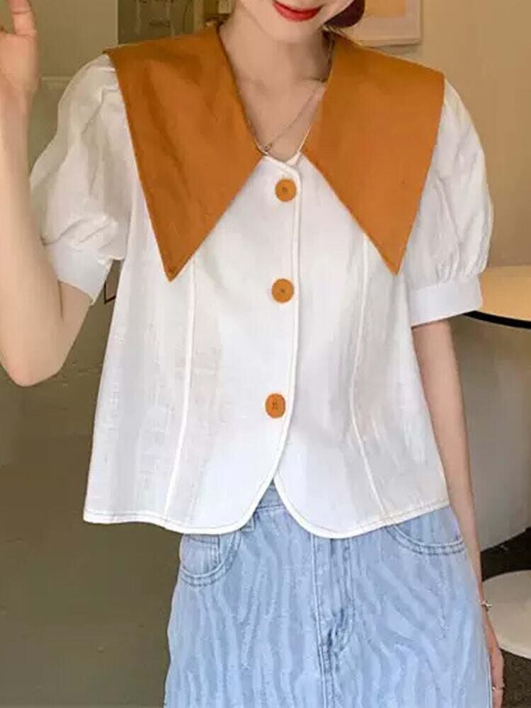 バイカラーの襟と3つのボタンがきれいめでかわいい半袖ブラウスです。