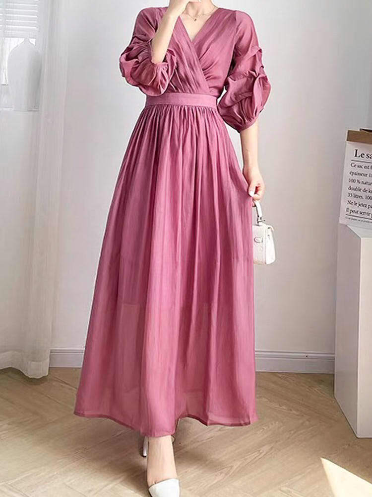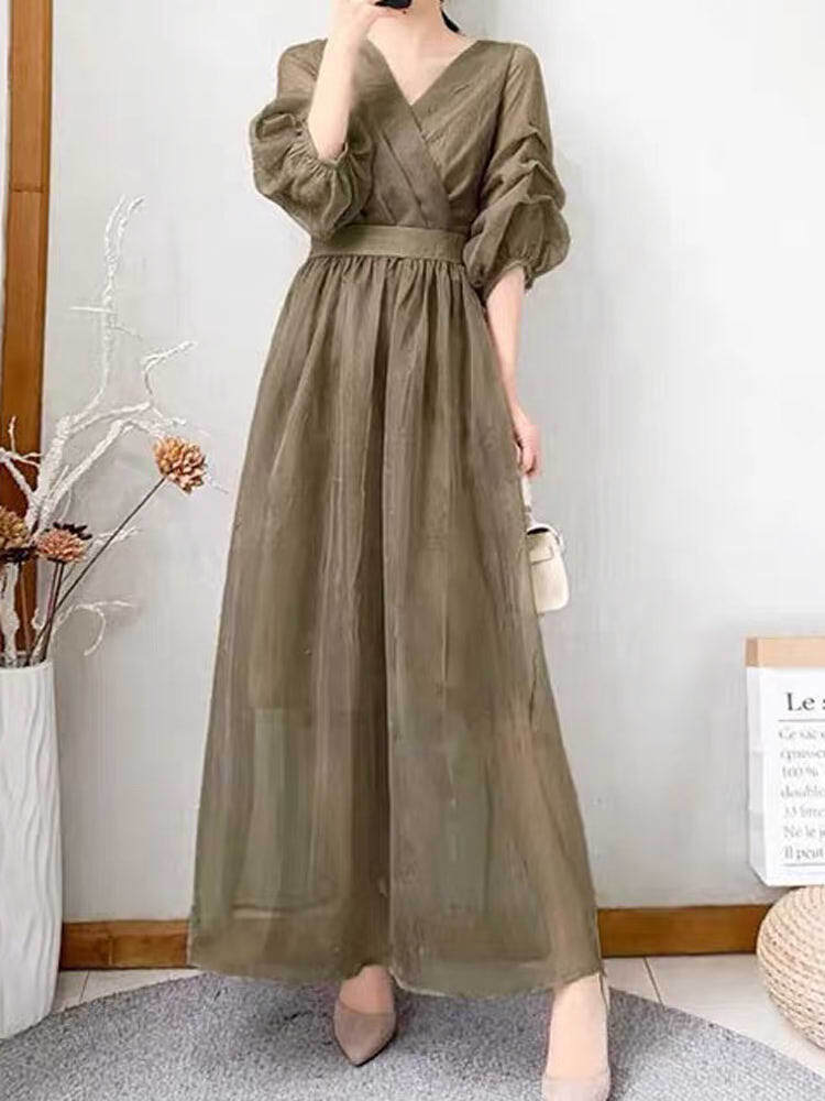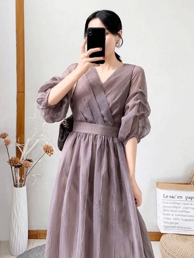 綺麗め清楚女子のエレガント透け感ワンピース ギャザースリーブ シアー ロングワンピース お呼ばれコーデ フォーマル きれいめ かわいい おしゃれ 大きいサイズ 韓国 CH4998