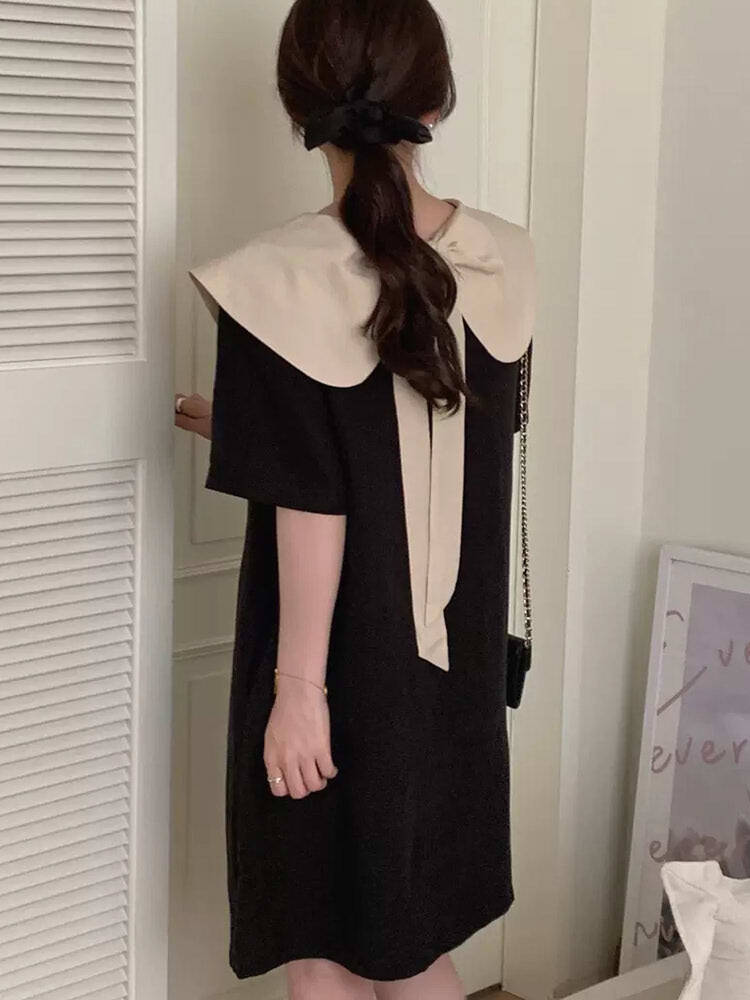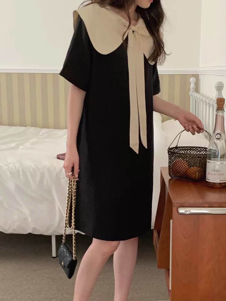 配色ビッグカラー2WAYワンピース フェミニンコーデおしゃれ 襟付き フォーマル 大人かわいい リボン 大きいサイズ 韓国 CH5140