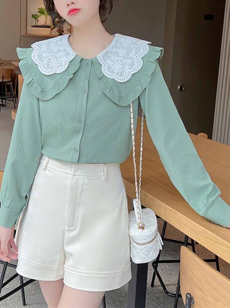 配色レースビッグカラー長袖ブラウス デート 女子会 襟付き レース バイカラー 大きいサイズ 韓国 CH5196