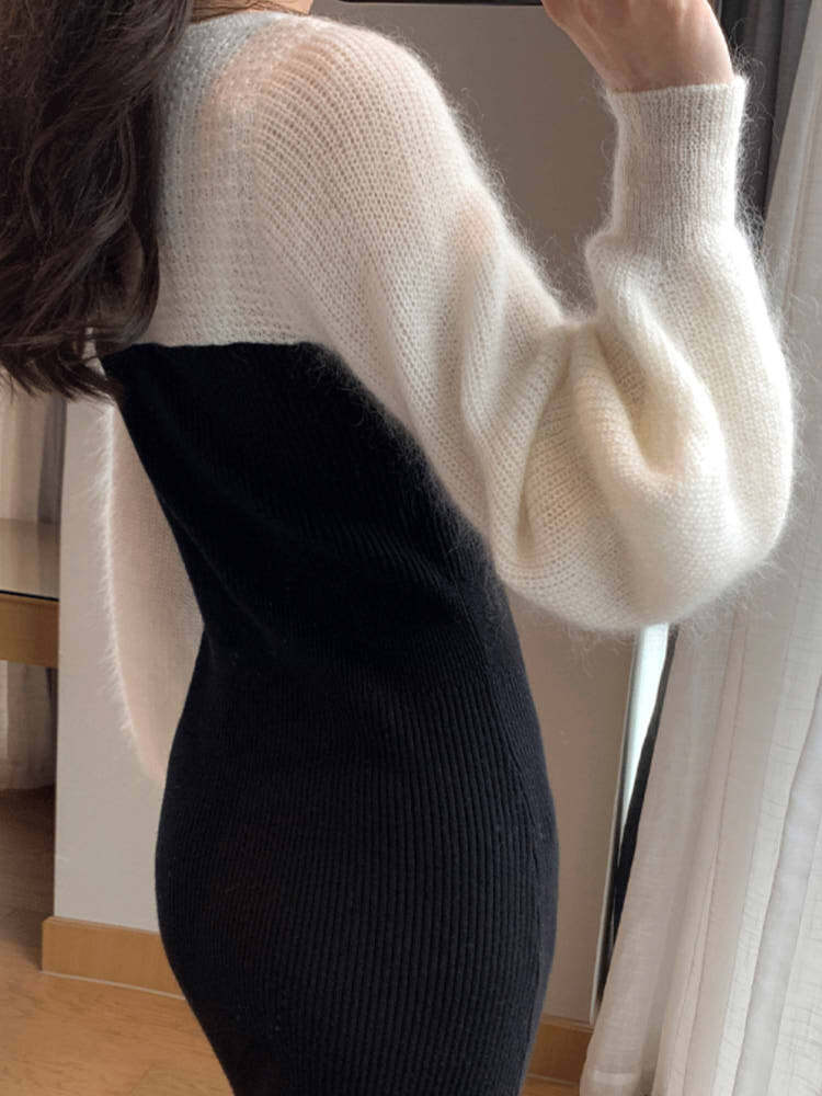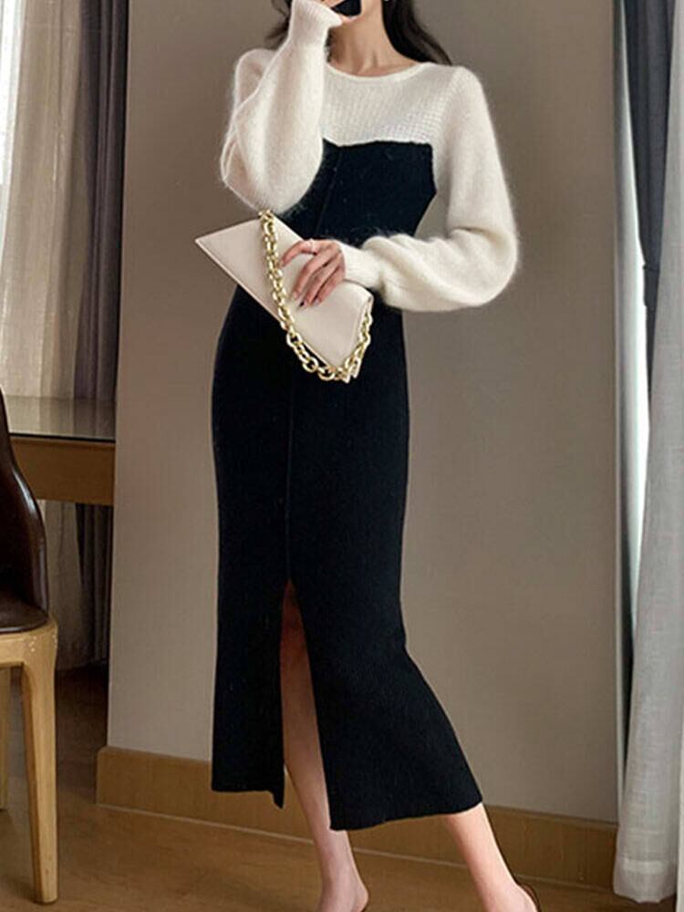 バイカラー可愛げお姉様系ニット スタイルアップ フロントスリット ニットワンピース 大人きれいめコーデ かわいい カジュアル ロング丈 大きいサイズ 韓国 CH5257