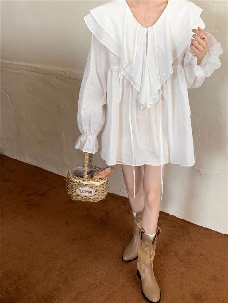 大きなフリル襟やキャンディスリーブでガーリーコーデを楽しむチュニックブラウス。