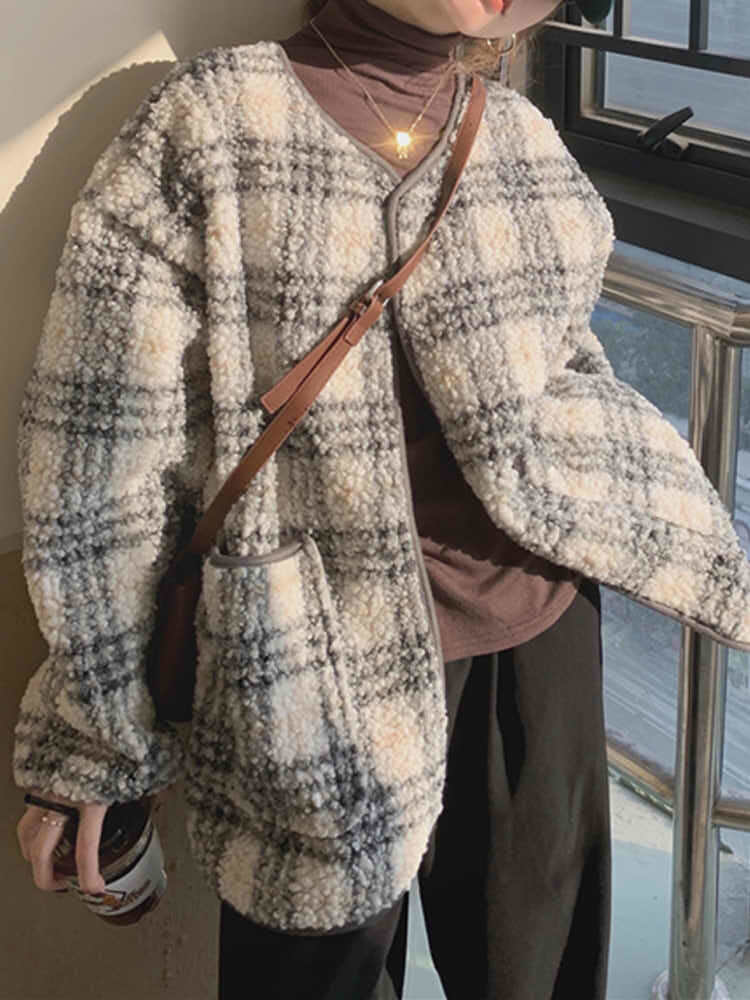 チェック柄ボアジャケット 大人かわいい きれいめ カジュアル ノーカラー ファー ポケット付き 大きいサイズ 韓国 CH5329