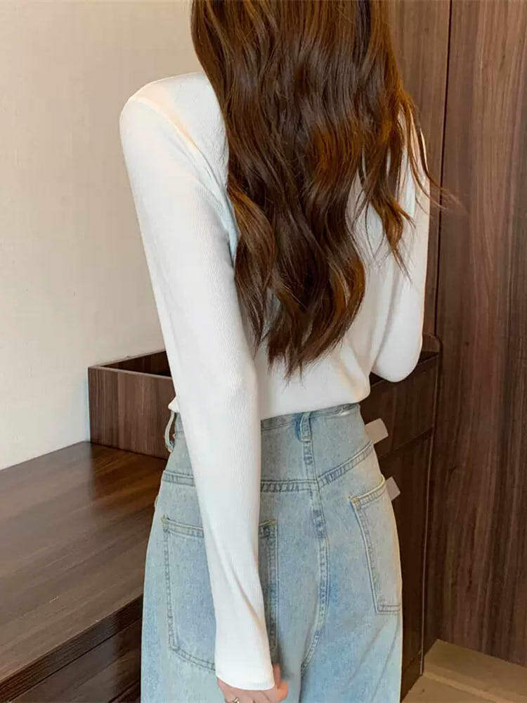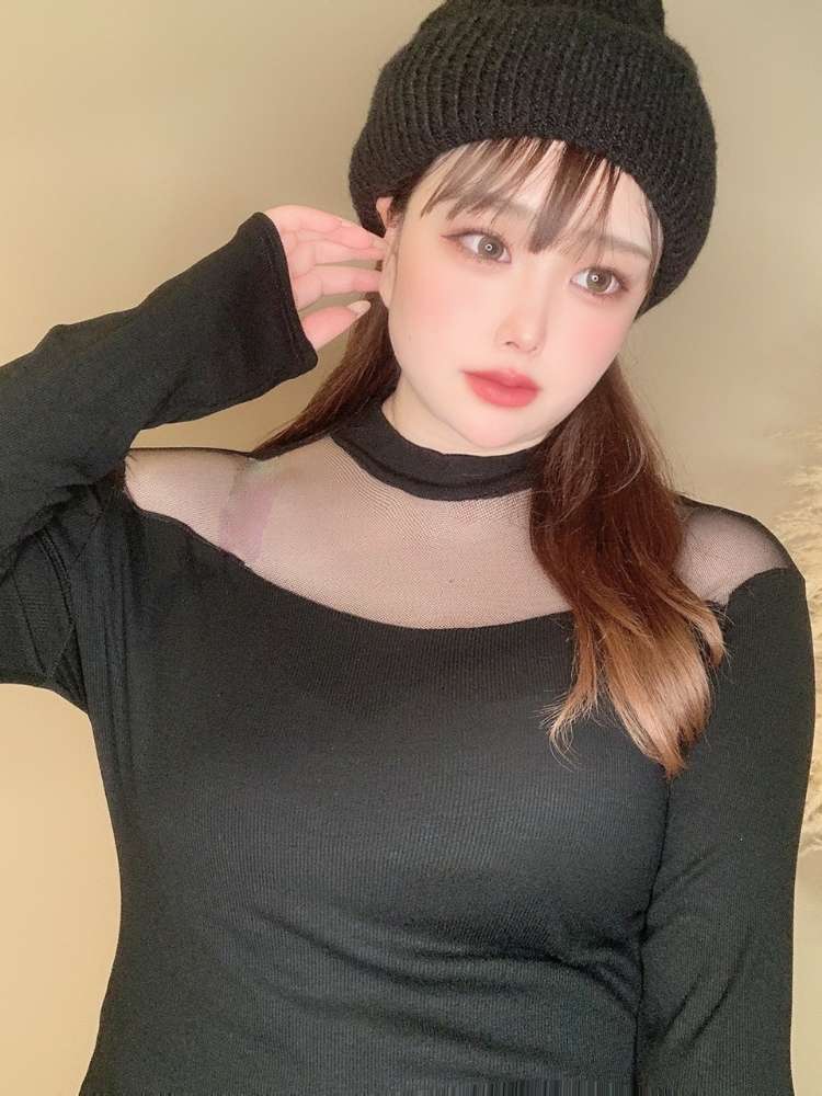 透け感のあるデコルテで周囲とぐっと差をつけるコーデに!ワントーンのハイネックトップスです。