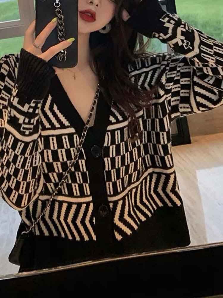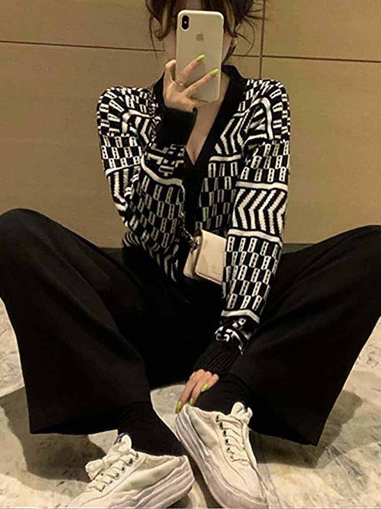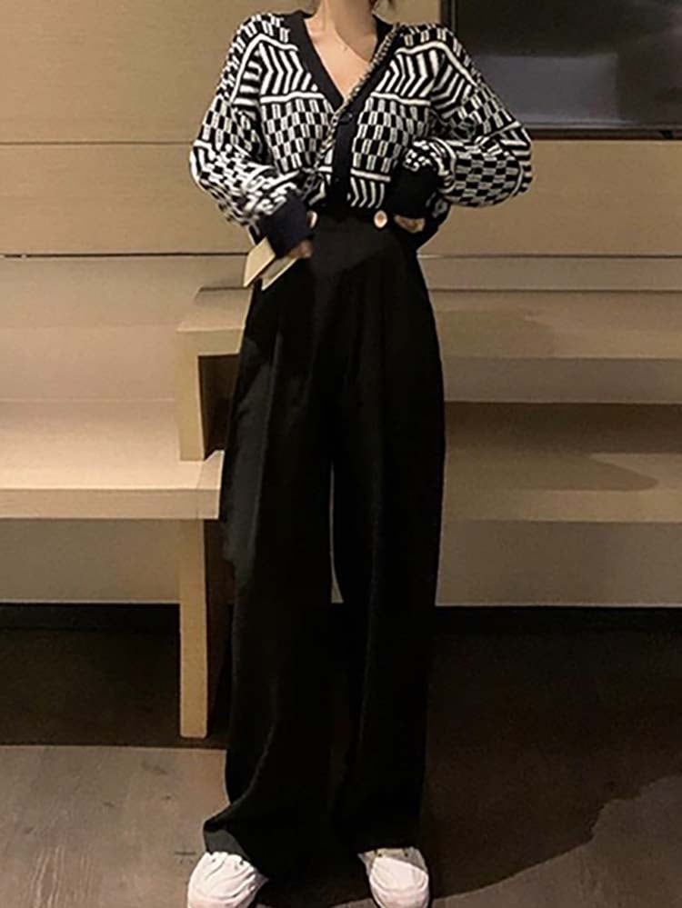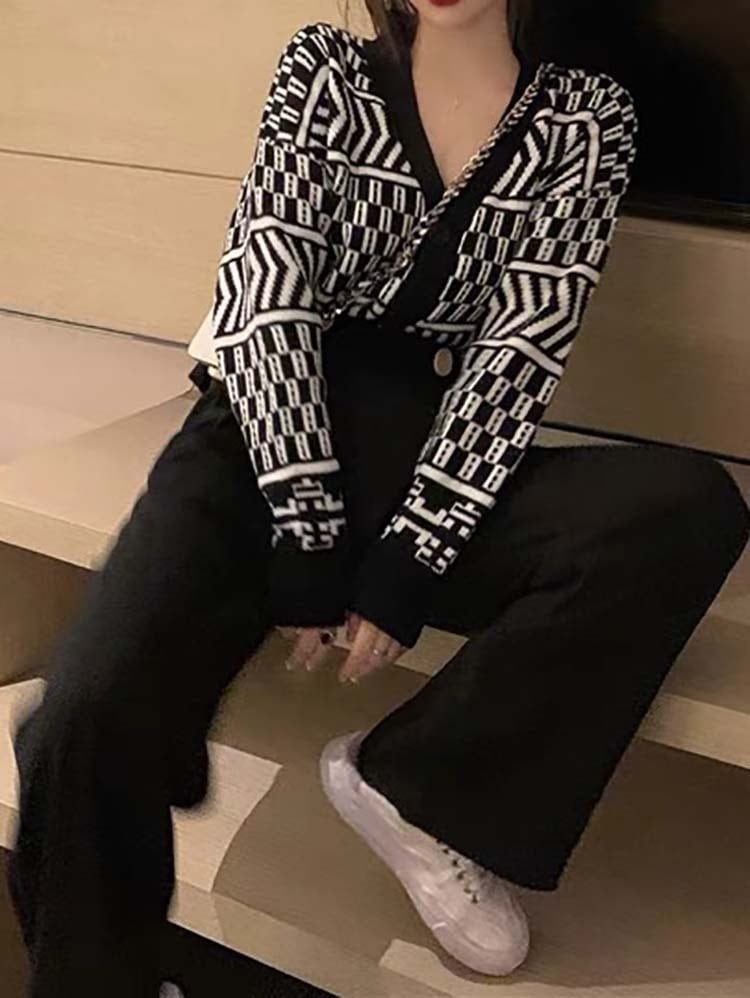 幾何柄カーデ×リラックスパンツ 上下セットアップ 大人カジュアル Vネック モノトーン 大きいサイズ 韓国 CH5373