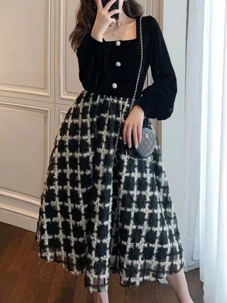 スカート部分はチェック柄に切り替わり、ふわっと広がるフレアでかわいい要素も忘れずに♡