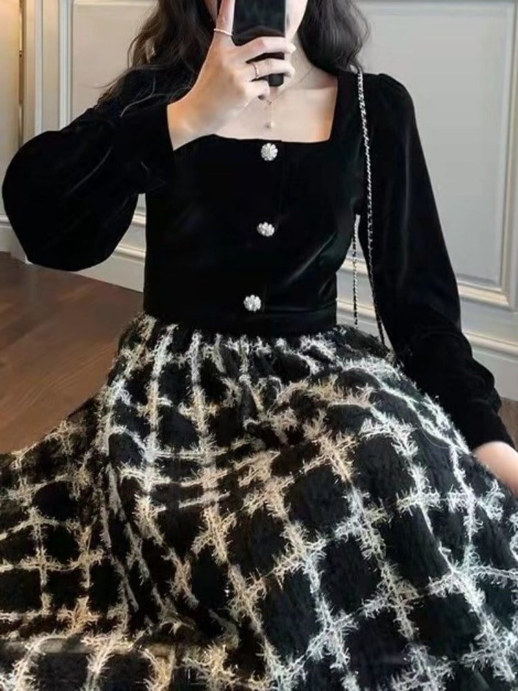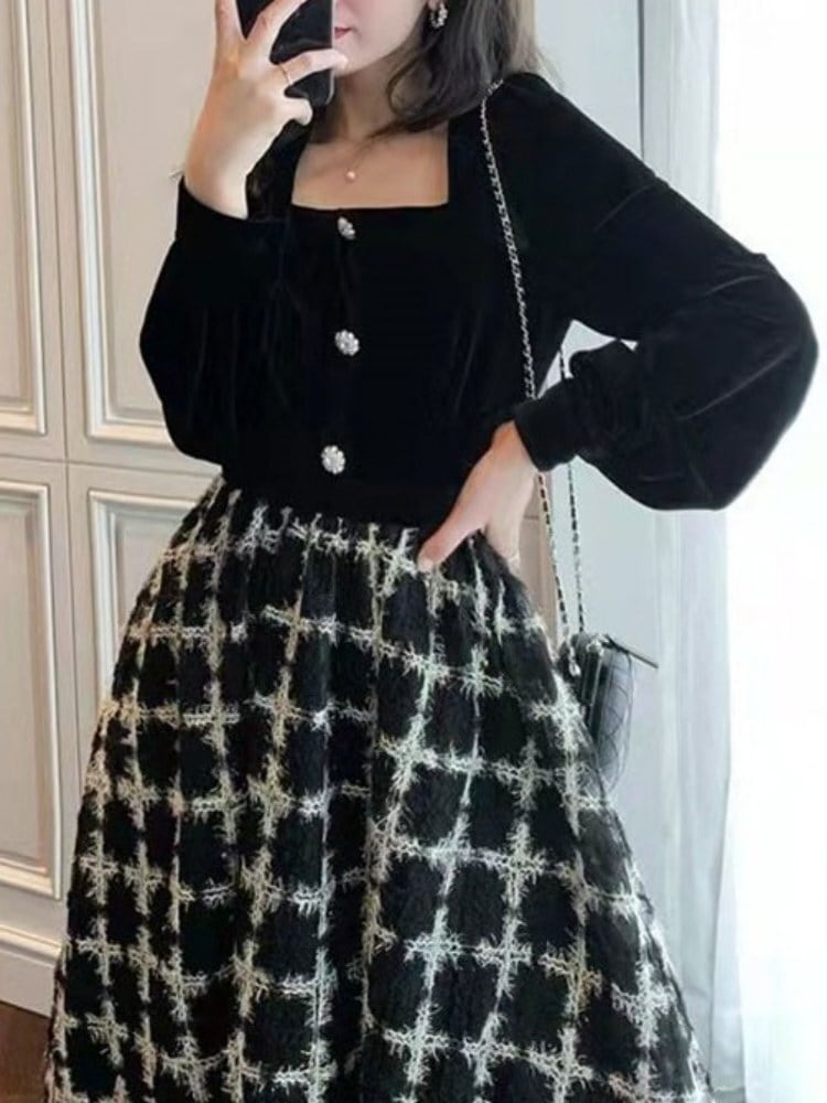 ノスタルジックな雰囲気で上品お洒落な、ベロア素材風Aラインワンピースドレス♡