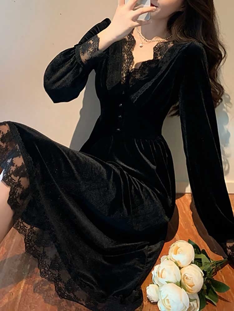 ベロアVネックレースワンピース フォーマル パーティー 大人 ミモレ丈 黒 大きいサイズ 韓国 CH5913